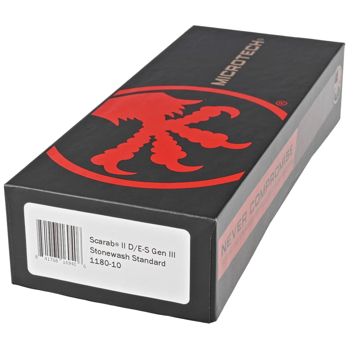 Scarab II Gen III D/E-S Black Aluminum/3M, Stonewashed is the pinnacle of excellence in automatic tactical knives, taking inspiration from the original Microtech Ultratech design. Built to withstand the toughest conditions, the new Scarab II is the ultimate choice for heavy use. While retaining the styling features of its predecessor, it sets a new standard for OTF (Out The Front) technology.
