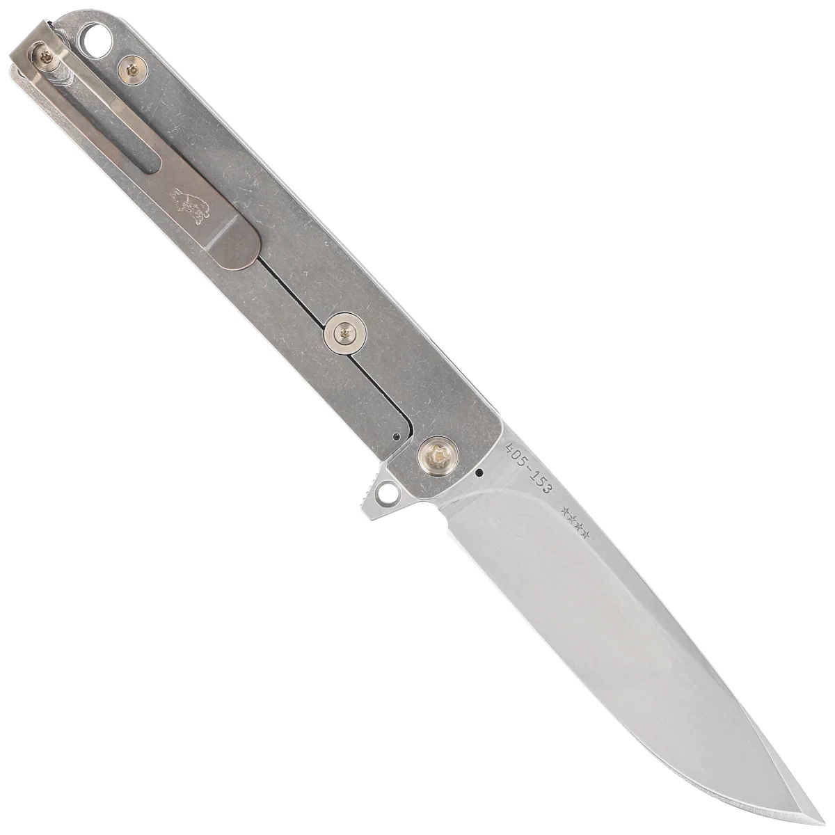 Blade - slim Drop Point profile finished with a machine-applied "tumbled" method. The hand-crafted hollow grind provides exceptional cutting performance combined with with high strength. The innovative Magnus Edged cut strengthens the tip of the knife. Ball bearings are used for smooth operation of the opening mechanism, so the knife opens smoothly and noiselessly. The flipper fin, when unfolded, acts as a mini guard to protect our hand. A powerful titanium frame lock bar secures the knife from folding, unfolded and secured the knife is as solid as an armored cash register.