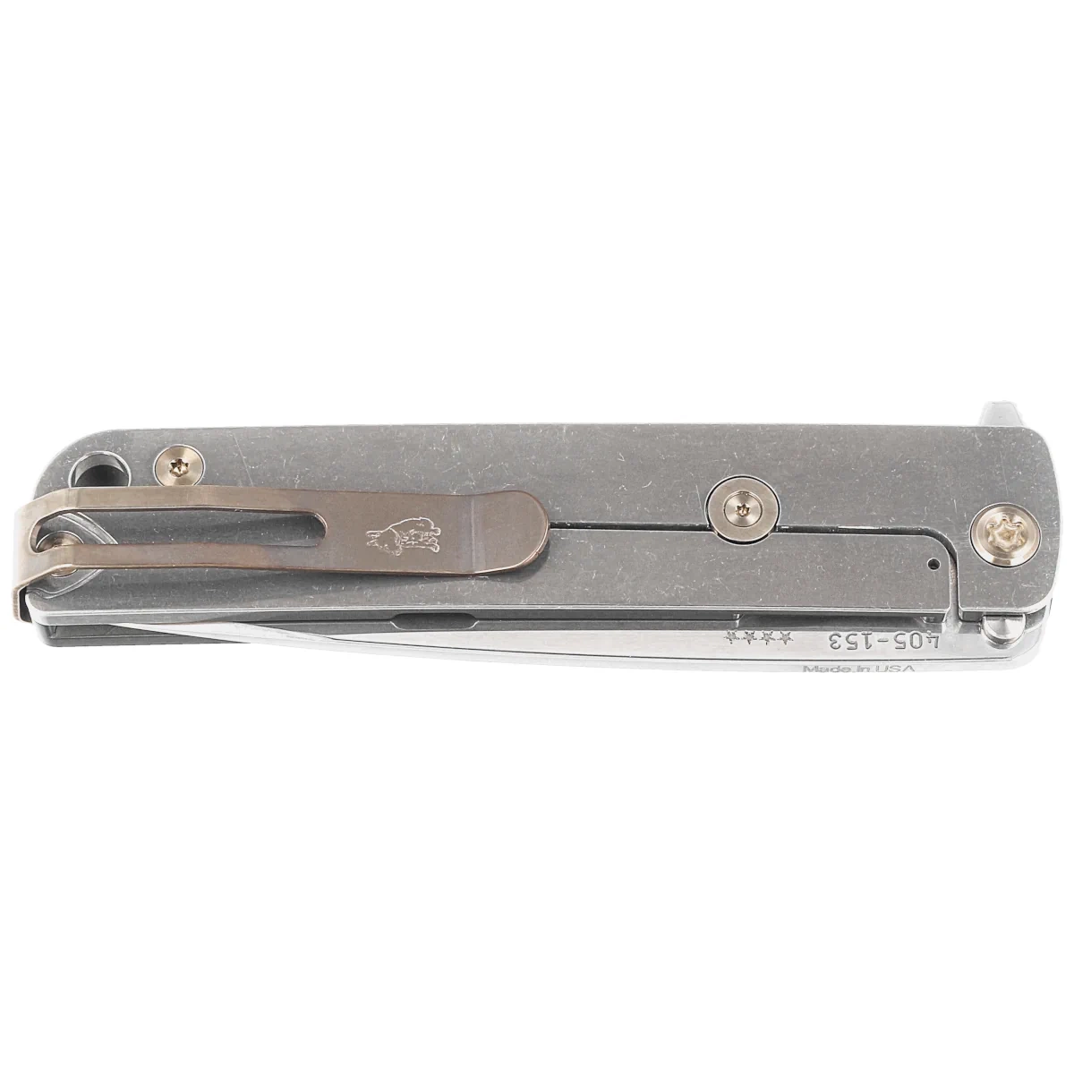Handle - the display side of the Handle is green PVD-coated aluminum, the lock side is titanium finished with "tumbled" method. The imprint of a tank track with the M-48 tank designation are embossed on the aluminum. The whole is complemented by a solid clip, of course, made of titanium. The screws and the two-position (right/left) deep carry clip are finished in bronze.