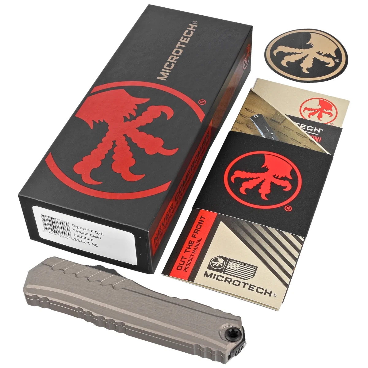 Microtech Cypher II D/E OTF Knife Natural Clear Aluminum, Black M390MK by Deryk Munroe and Tony Marfione (1242-1NC)