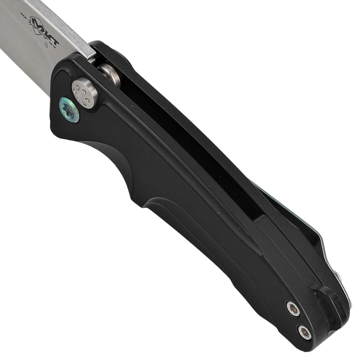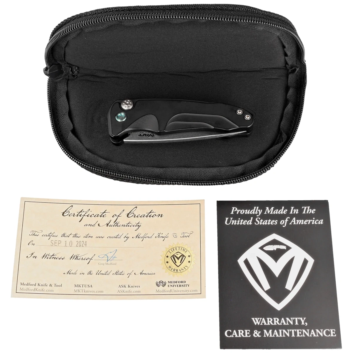 Handle - two solid pieces of aluminum in black, hard anodized with a light polishing perfectly match the sturdy construction of Medford Knives. The stepped texture of the scales and finger grooves, provide excellent grip during use. The backspacer ends with an oval opening for interlacing a safety or decorative cord. An elaborate blade lock button (button lock) decorates the handle and makes it easy to hit with the hand, for example, when wearing a glove. The whole is complemented by a titanium deep carry clip. The clip and screws (HW) anodized green color.
