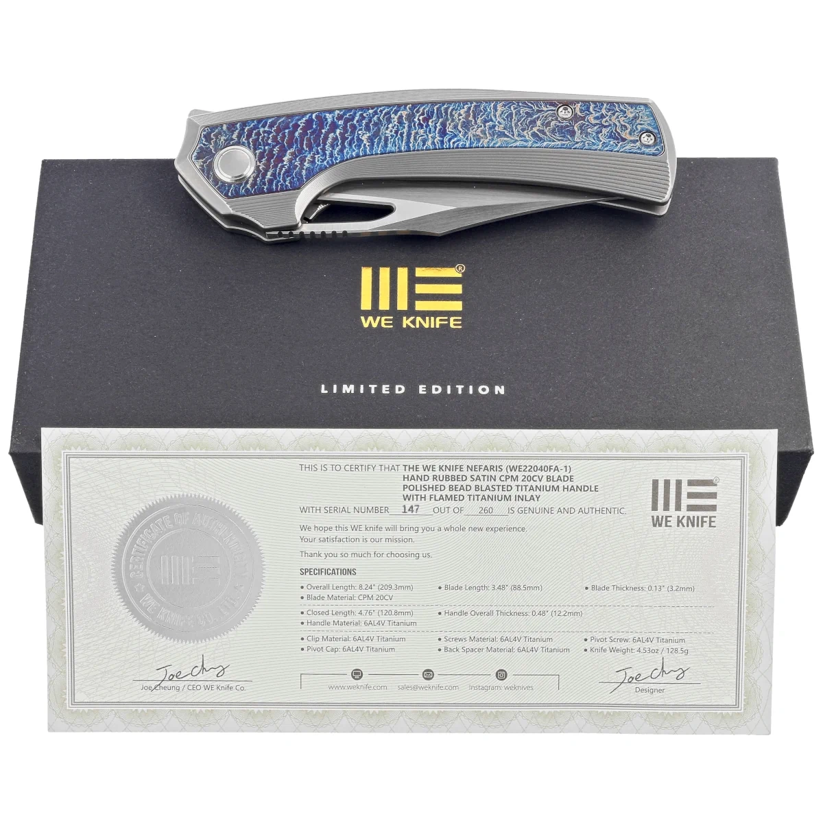- Nefaris Gray/Flamed Titanium, Hand Rubbed Satin LE. Limited edition WE Knife limited to 260 pcs knife numbered 147. Perfectly crafted titanium Handle with flame-dyed titanium inlay, CPM 20CV steel blade.