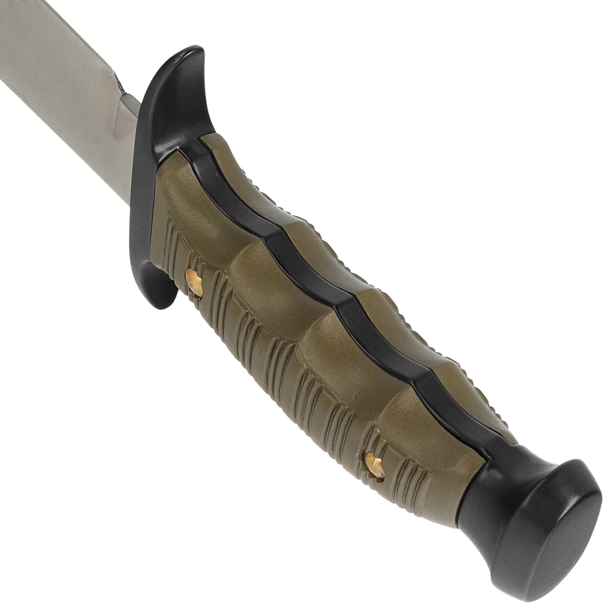 7182 Green ABS, Satin, a large hunting and outdoor knife in 420 stainless steel. Handle made of flexible elastomer ensures a comfortable and secure grip. Hand-stitched leather sheath included. Will not fail in any situation!