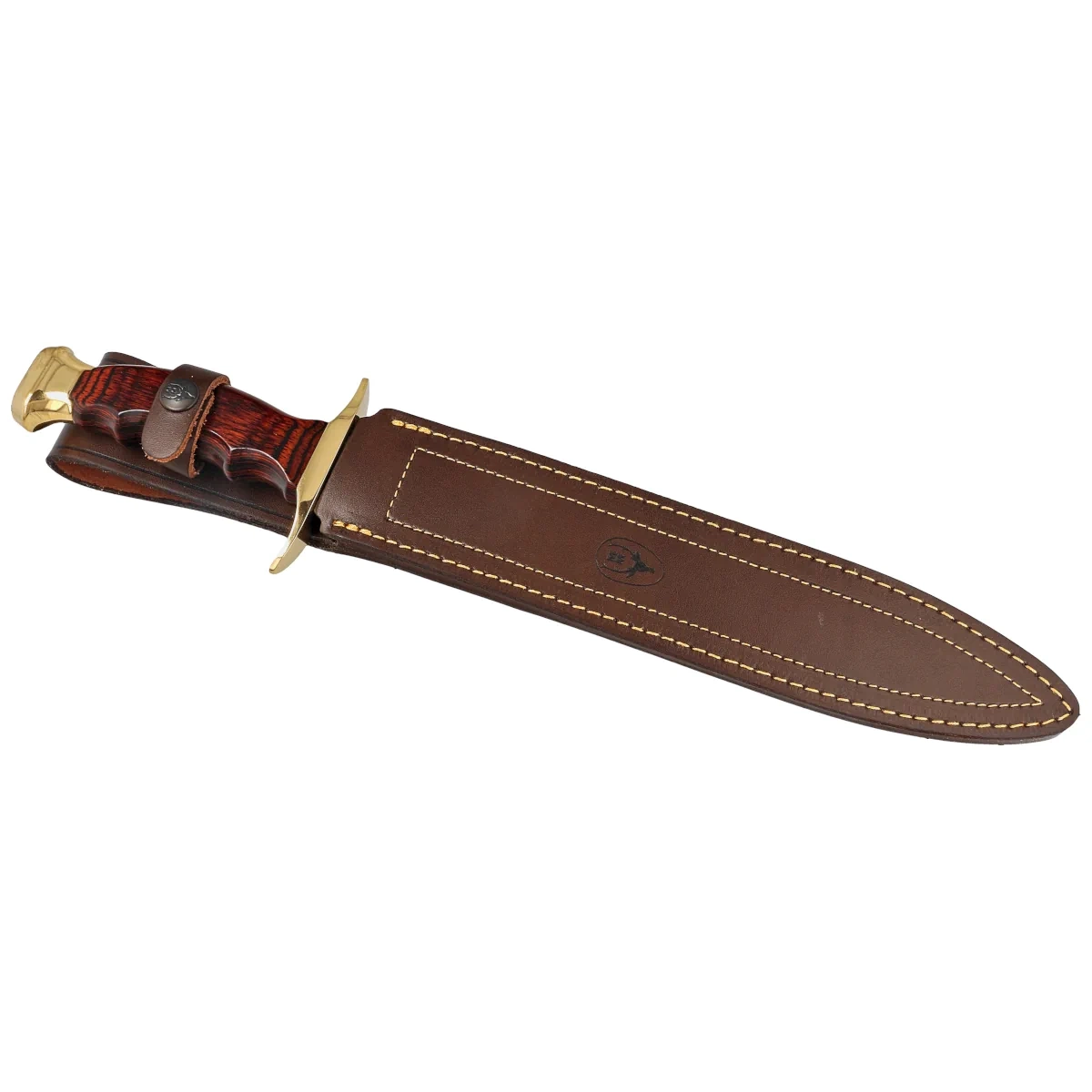 - BW-26 fixed blade knife crafted from molybdenum-vanadium (MoVa) steel, designed for versatile outdoor tasks. Features unique patterned handles made from synthetic coral pakka wood, accented with brass pommels. Includes a hand-stitched leather sheath.