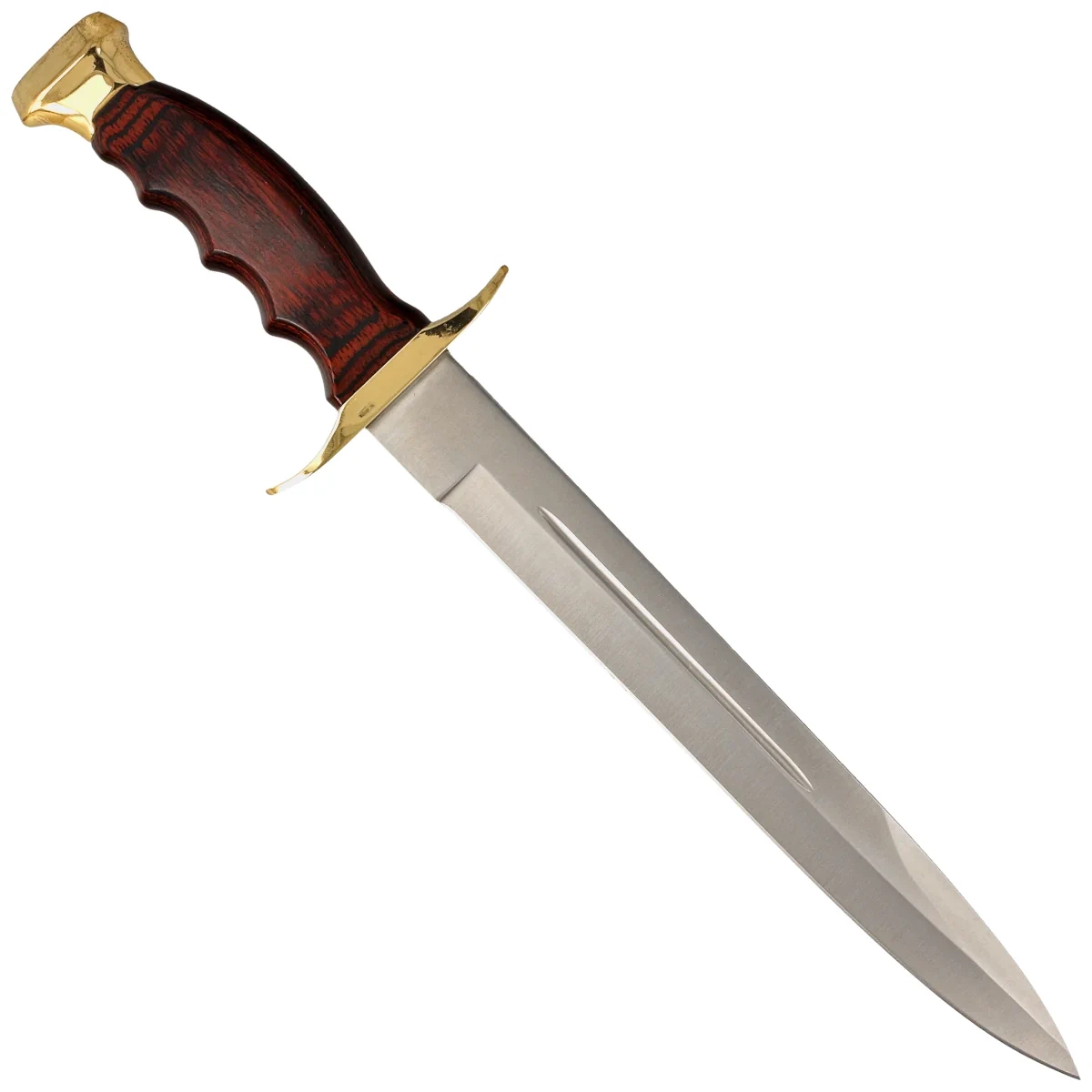 Handle - made of Pakka wood. The profiled Handle eliminates sharp edges for comfortable grip and the texture on the surface improves grip confidence. A decorative pin with the company's logo adds an elegant touch. Guard and Pommel made of brass.