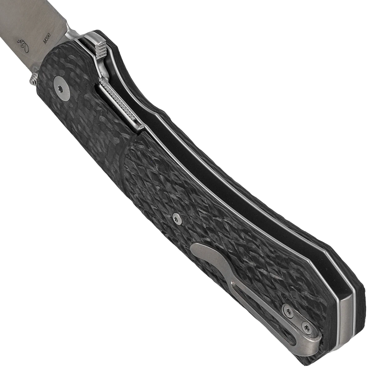 Handle - made of Carbon Fiber composite, virtually indestructible plastic, insensitive to weather conditions, resistant to chemicals and mechanical damage. In the rear part, a milled 3D texture to improve grip confidence. The grips are screwed to a CNC-milled titanium backspacer, which provides the desired rigidity of such a design. The chamfering of the cover eliminates sharp edges for comfort, and the fore finger groove made on the front improves grip confidence. A right-handed, single-position deep titanium clip allows you to carry the knife discreetly in tip-up (tip up) position.