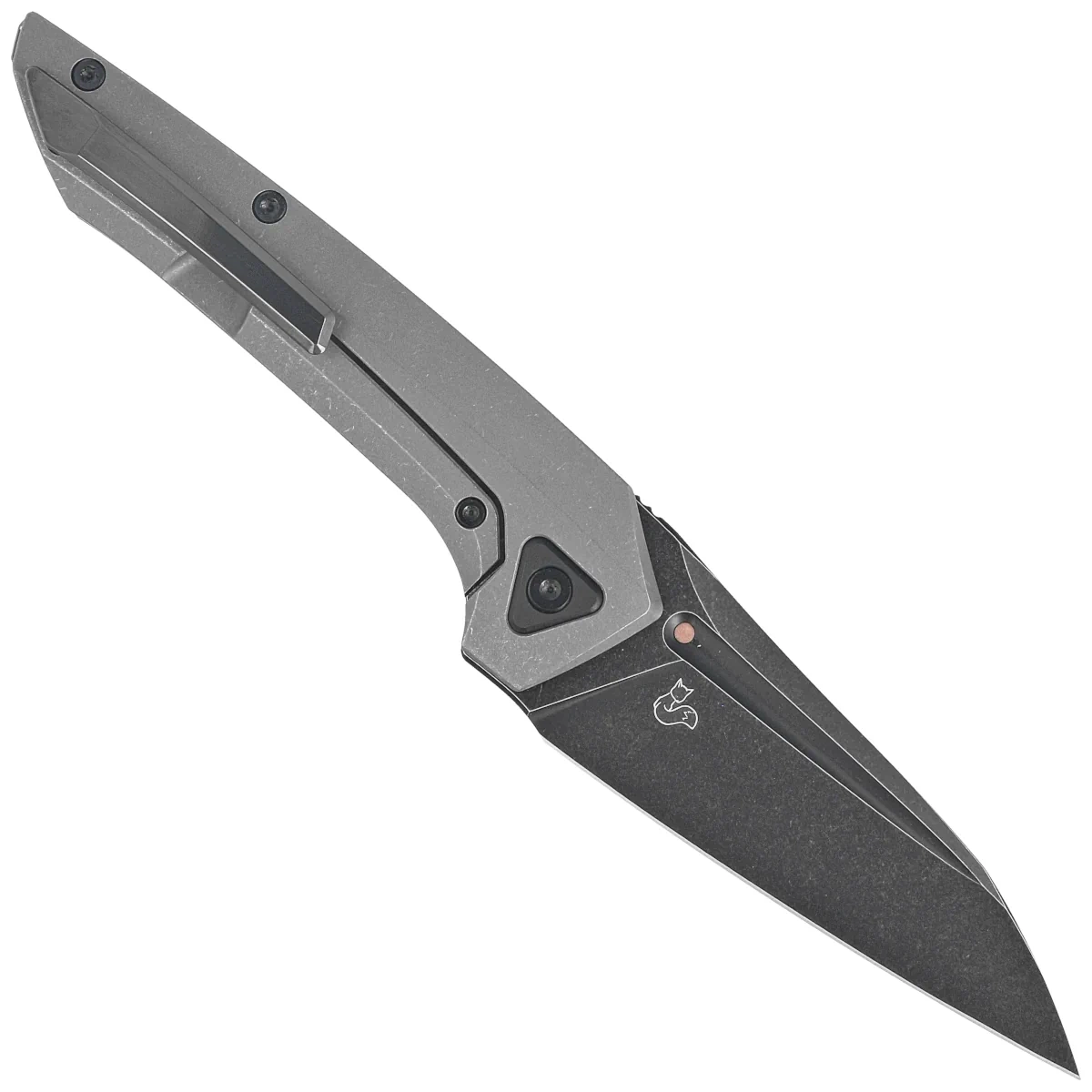 Blade - Wharncliffe type finished with a scratch-masking bath of fine Stonewashed pebbles and then coated in black. It opens with a front flipper (index front flipper), so it can be used by right and left-handed people without any problems. Ceramic ball bearings are responsible for the smooth operation of the opening mechanism. The small thickness of the blade, combined with a high, flat grind (Flat Grind), gives excellent cutting edge geometry and extreme cutting performance. The entire blade is locked with the proven and popular frame lock with a steel inlay to prevent wiping of the lock face. At the Handle inlay in the form of a dot made of copper, the characteristic mark of Vulpex Knives.