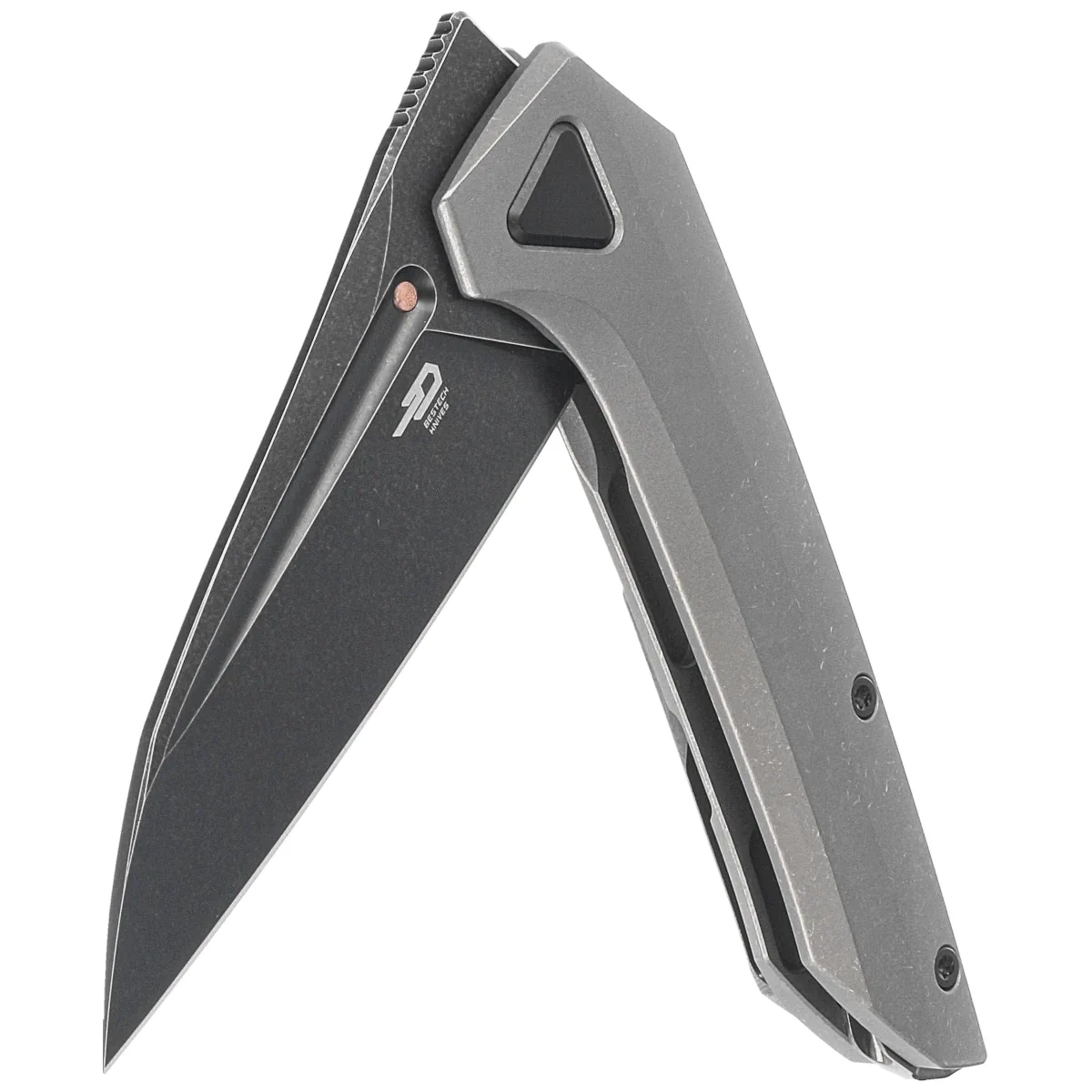 Handle - solid titanium 6AL4V, glazed for a more secure grip. Joined together by a massive backspacer made of Zirconium. The simplicity and solidity of the design give the assurance of many years of use. The pivot axis was placed inside a triangular steel inlay. Single-position clip (right), made of Zirconium, allows to carry the knife in tip-up position.