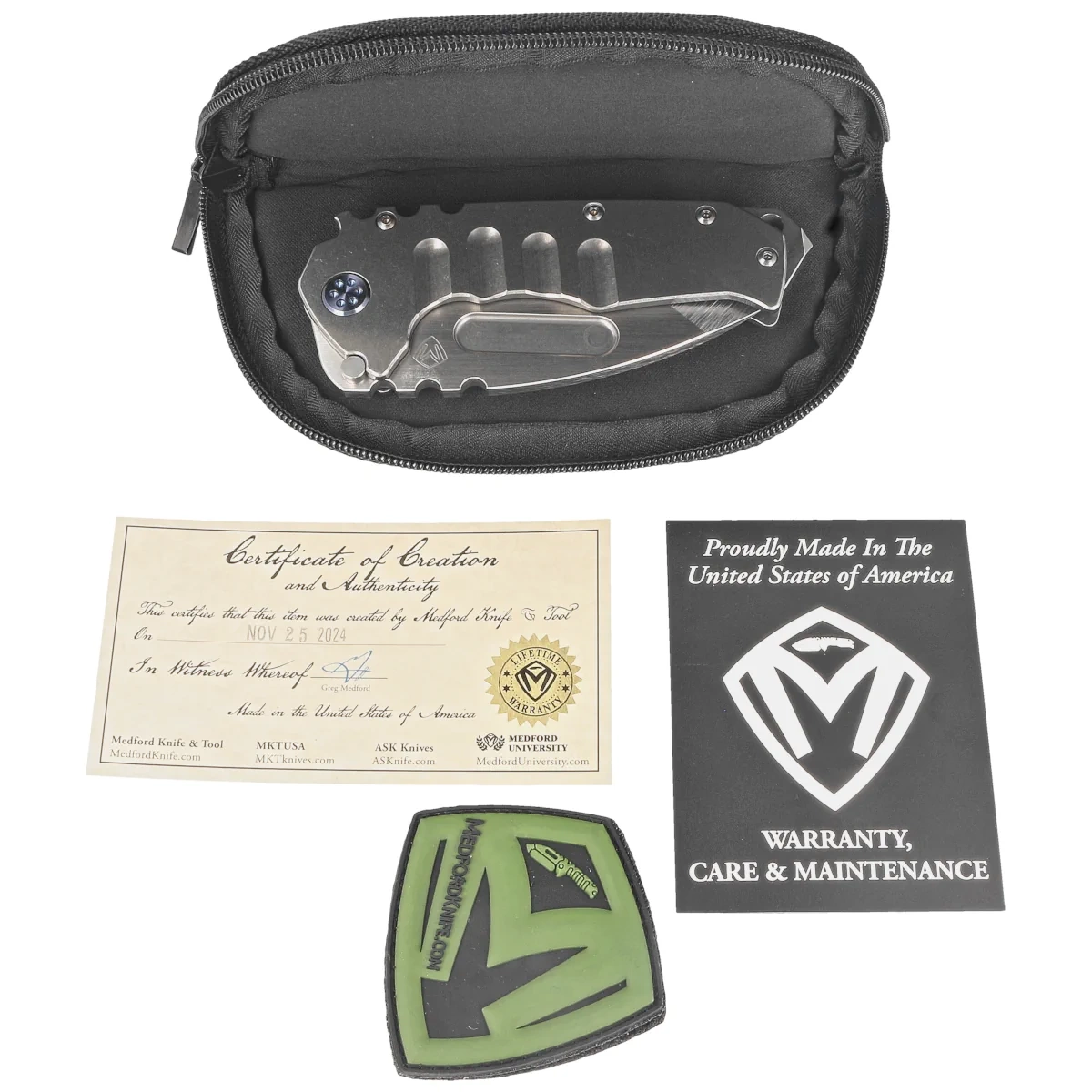 Included - cardboard box, nylon pouch, company patch with Velcro attachment and signed “Certificate of Creation and Authenticity”.