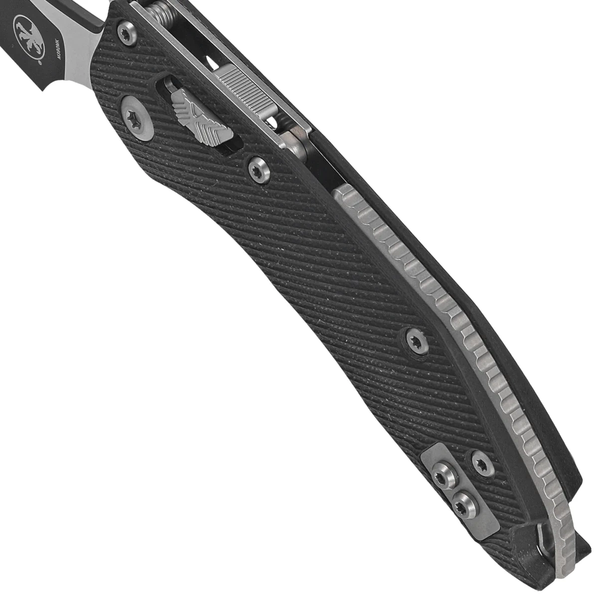 Handle - made on CNC milling machines with excellent precision, made of G10 composite, a virtually indestructible material insensitive to weather, resistant to chemicals and mechanical damage, with a deeply milled 3D Fluted structure. Wide locking slide with Microtech's signature stepped X structure. Both grips are bolted together with a solid aluminum backspacer. The double-sided (right / left) clip allows you to discreetly carry the knife in tip-up position. The protruding part of the backspacer in which there is a hole for a rope, can also serve as an improvised glass breaker.