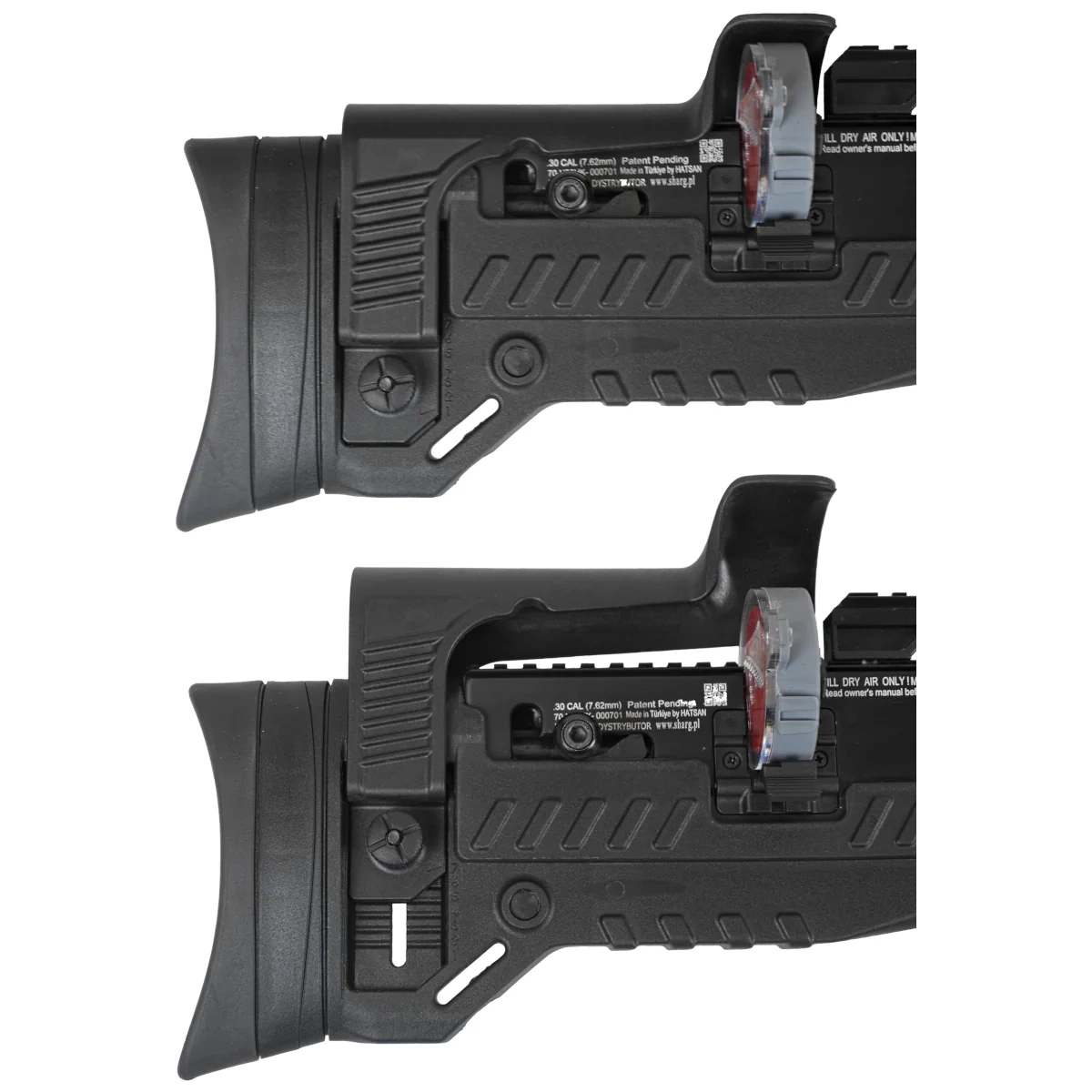 Stock - a tactical bullpup stock with a thumbhole (TH). Rubber inserts on the pistol grip and textured forearm enhance control and comfort. The ambidextrous stock features an adjustable rubber butt pad and height-adjustable cheek rest for easy customization.