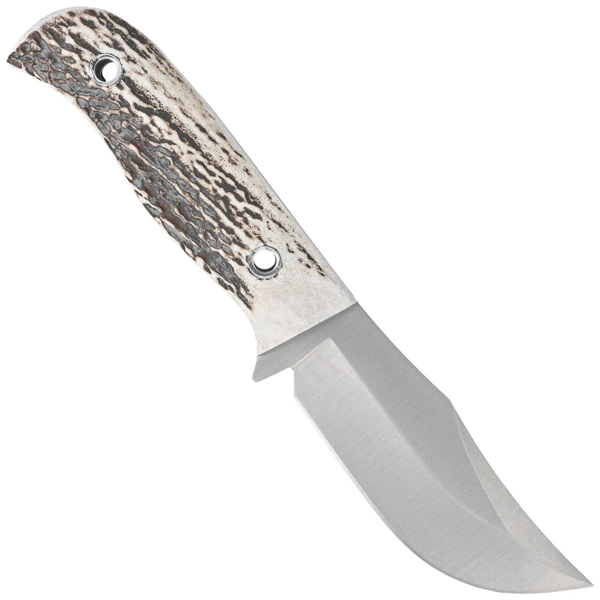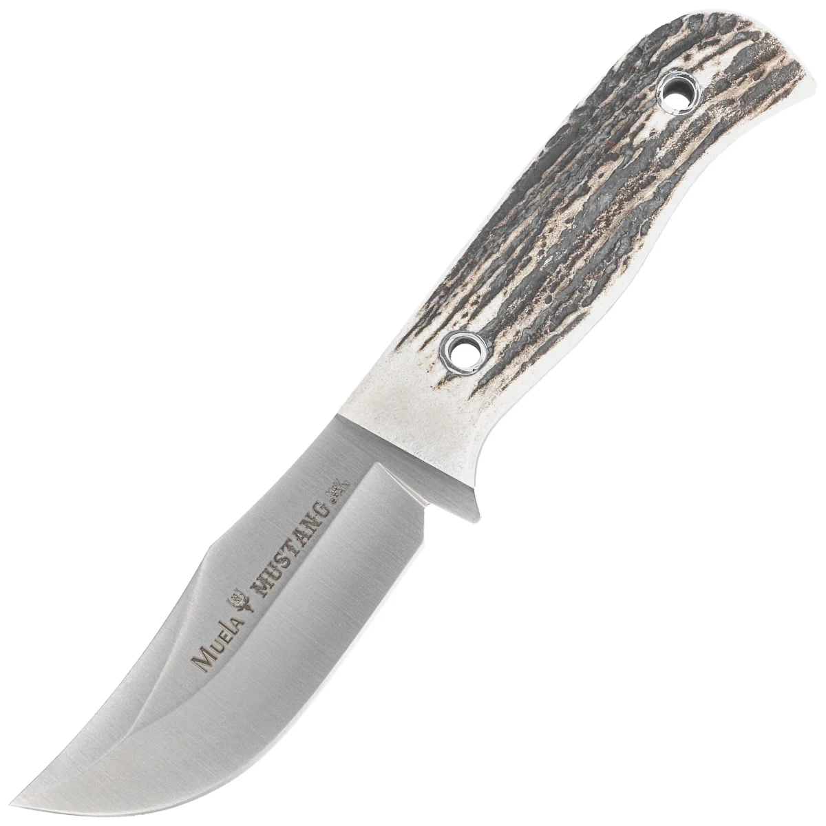 - Mustang-8A Red Deer Stag, Satin, a rugged hunting and outdoor knife made of MoVa molybdenum-vanadium steel. Providing an exclusive look, the handle is made of deer antler. Hand-stitched leather sheath included.