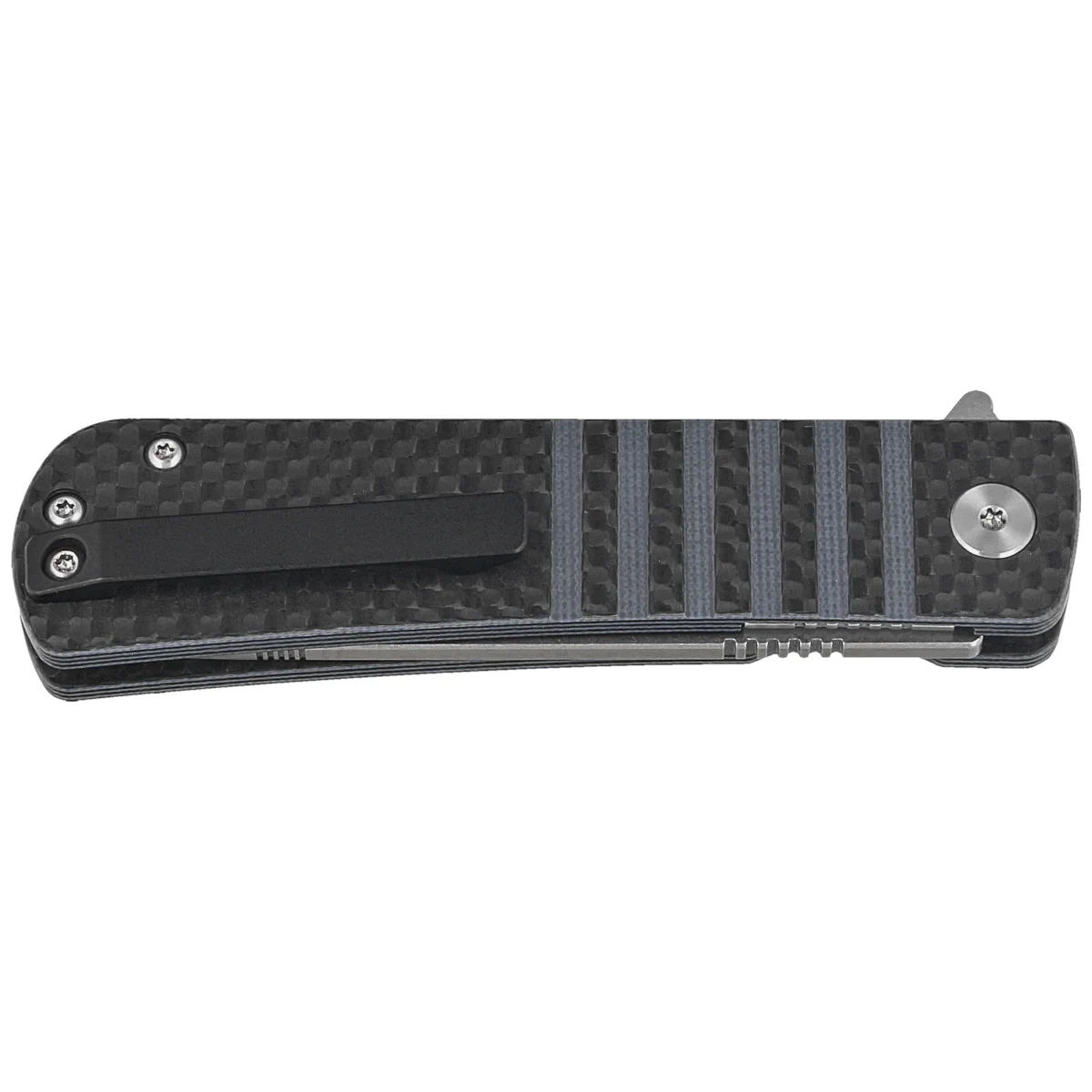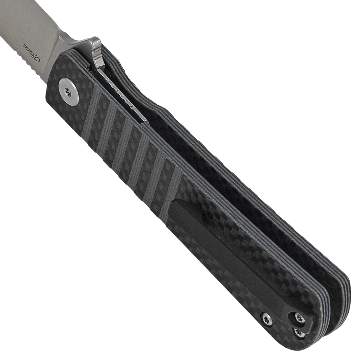 Handle - grips made of G10 composite laminated on the surface with a layer of Carbon Fiber, practically indestructible plastic insensitive to weather conditions, resistant to chemicals and mechanical damage. Chamfered edges of the covers eliminate sharp edges and characteristic vertical surface grooves improve grip security. The open-backed design, fixed with steel spacer sleeves, reduces weight and facilitates cleaning. The single-position (right) clip allows the knife to be carried in tip-up position, with the tip of the blade upward. Above the clip a hole for threading a safety or decorative cord.