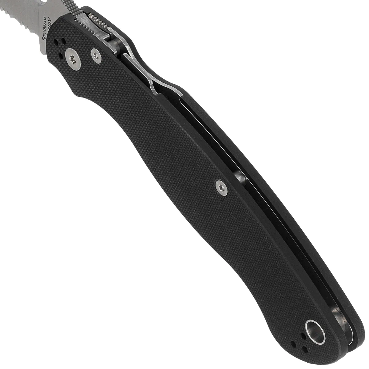 Blade - modified Clip Point profile with an enlarged 14 mm SpyderHole notch (Spyderco patent) that allows you to quickly open the knife even with a glove, enlarged thumb ramp with notches (spine jimping), which helps control the large blade. Index Finger Choil (notched profiled undercut for the index finger between the Handle and the cutting edge), prevents the folder from sliding in the hand when making powerful cuts. The partially serrated (P/S) blade, combined with the Full Flat Grind, results in excellent cutting edge geometry and extreme cutting performance.
