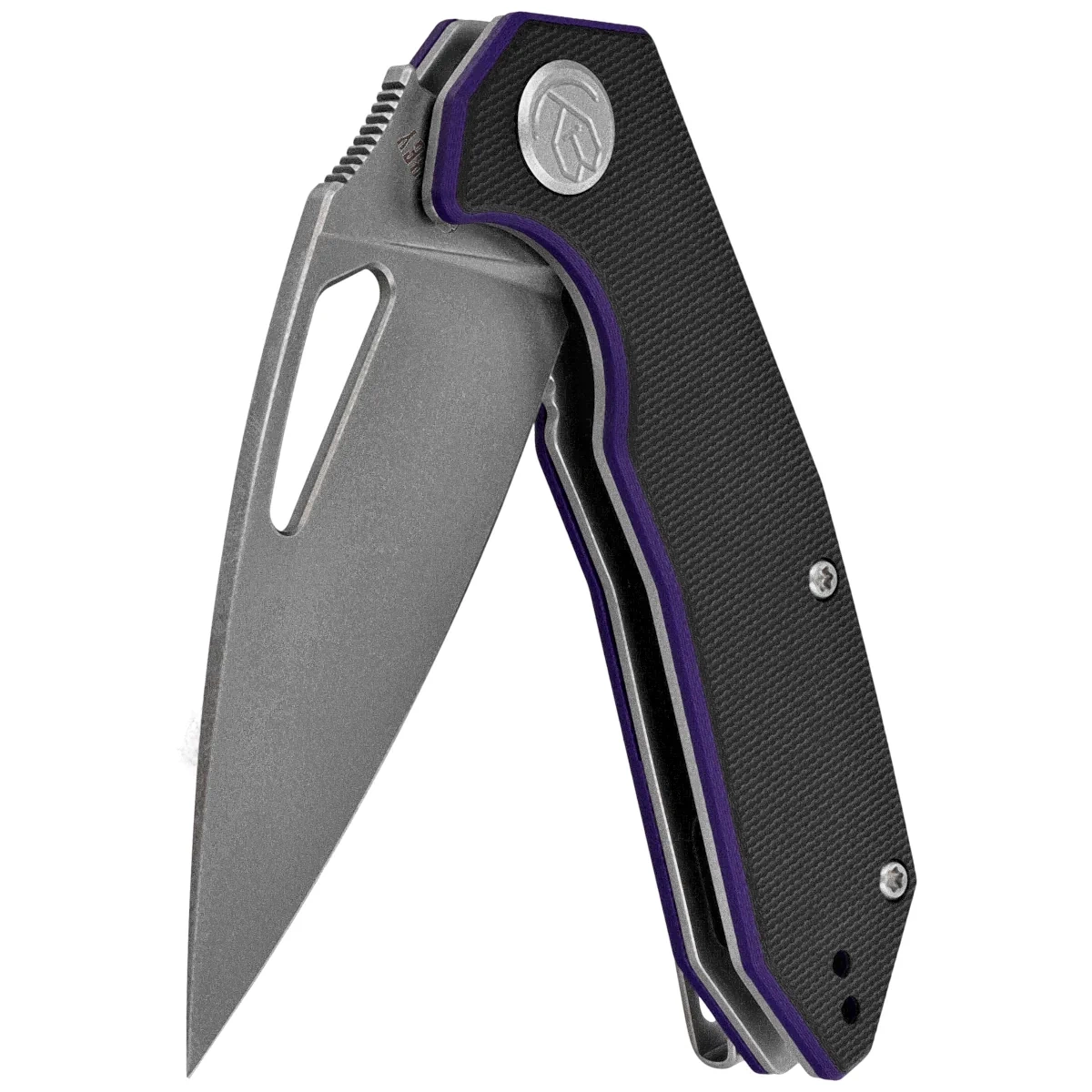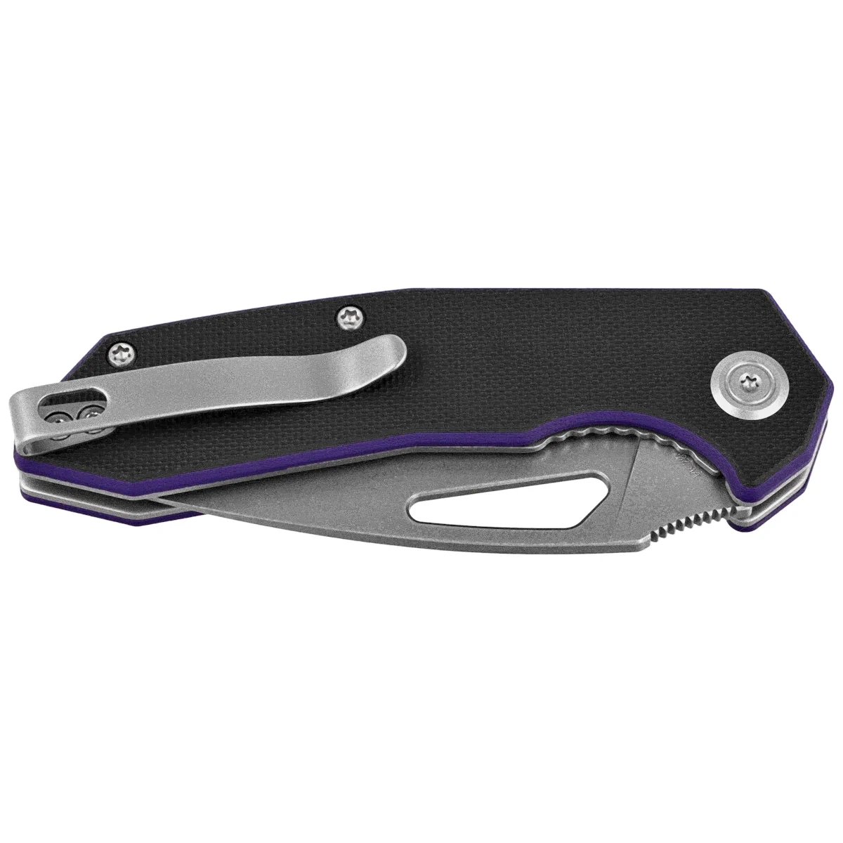 Handle - grips made of G10 composite, practically indestructible plastic, insensitive to weather, resistant to chemicals and mechanical damage, textured to improve grip, screwed to the steel frame of the knife. The so-called open-backed design without the typical backspacer, fastened together with steel spacer sleeves for easy cleaning. The simple, secure design gives assurance of many years of use. A fore finger groove improves grip security and creates a mini-guard to prevent the hand from slipping on the blade. The pivot is decorated with a stylized manufacturer's logo. A two-position (right/left) metal deep-carry clip allows you to carry the knife discreetly in your pocket in tip-up (blade tip up) position.
