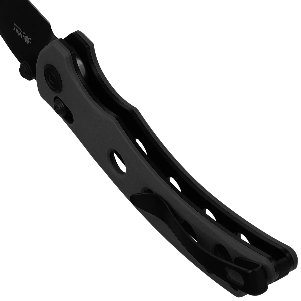 Handle - is two pieces of composite G10, a material extremely mechanically durable and practically completely resistant to weather conditions and chemicals, textured for improved grip security, screwed to the steel frame of the knife. The chamfered edges of the covers eliminate sharp edges for comfort and improve grip confidence. Serio holes in the Handle add visual lightness and relieve stress on the knife. Massive backspacer provides the desired rigidity and strength of the design Simple, secure construction gives confidence for years of use. A deep finger undercut (fore finger groove) improves grip confidence. The pivot axis is adorned with a stylized Kubey Knife brand logo. The two-position (right.left) deep carry clip allows you to carry the knife discreetly in your pocket in tip-up position (blade tip up).