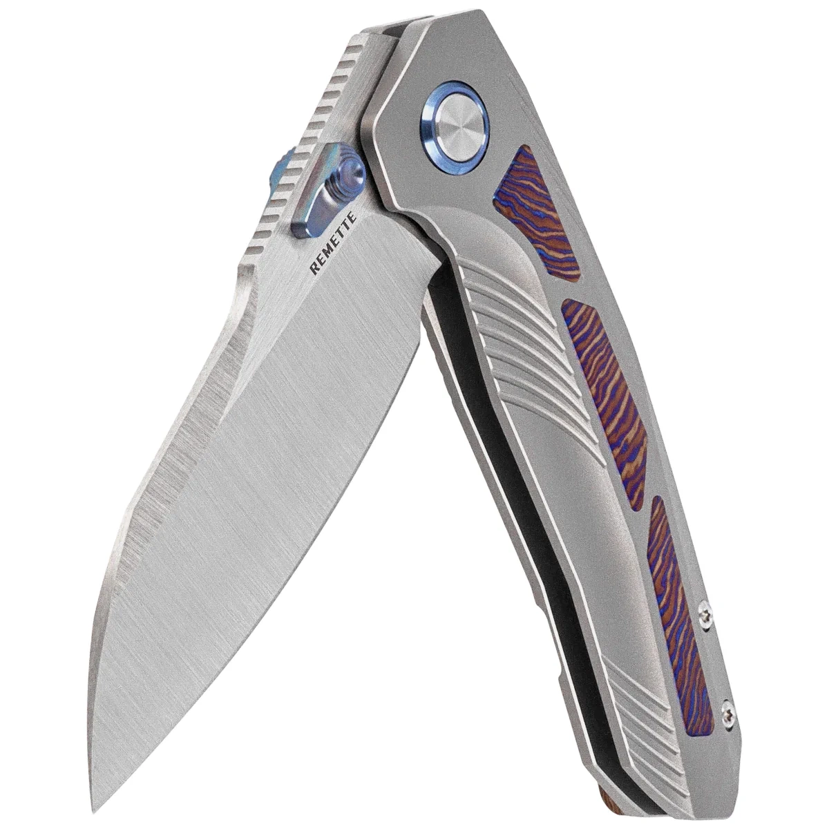 Handle - is thick pieces of titanium 6AL4V, contouring of the covers eliminates sharp edges. On both sides there is an inlay (insert) made of Timascus. Only a few companies are able to make the Handle with such incredible accuracy! The grips are joined together using a titanium backspacer. The right-side, single-position deep carry clip, also from Timascus, allows you to carry the knife discreetly in your pocket in tip-up (blade up) position. The pivot axis is decorated with a titanium rim (pivot collar cap).