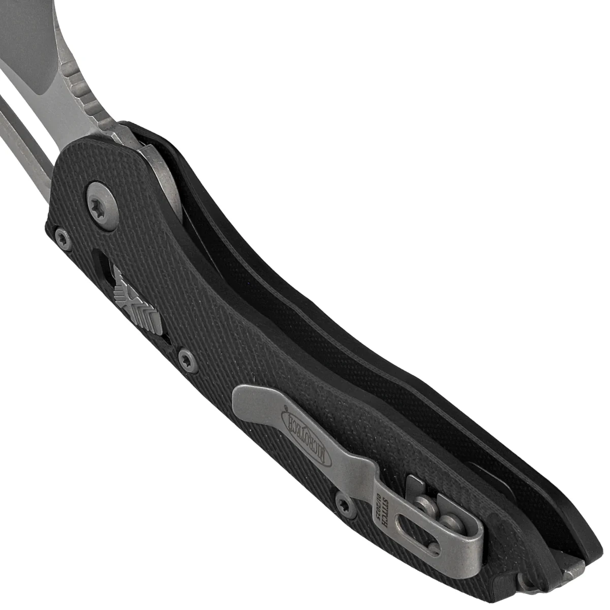 Handle - CNC milled with high precision from G10, a virtually indestructible composite material that is resistant to weather, chemicals and mechanical damage, with a deeply milled 3D fluted texture. Wide locking slider with Microtech's signature X-pattern texture. Both grips are screwed together with a solid aluminum backspacer. A two-sided (right/left) clip allows the knife to be carried discreetly in a tip-up position. The protruding part of the backspacer, which has a hole for a cord, can also be used as an improvised glass breaker.