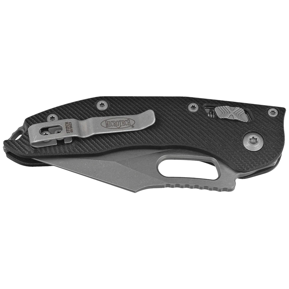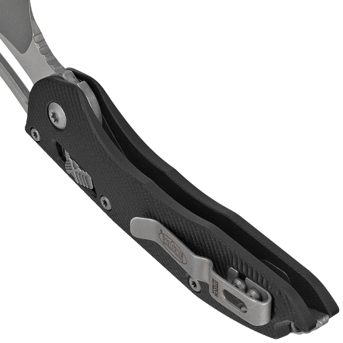Handle - CNC milled with high precision from G10, a virtually indestructible composite material that is resistant to weather, chemicals and mechanical damage, with a deeply milled 3D fluted texture. Wide locking slider with Microtech's signature X-pattern texture. Both grips are screwed together with a solid aluminum backspacer. A two-sided (right/left) clip allows you to carry the knife tip-up. The protruding part of the backspacer, which has a hole for a cord, can also be used as an improvised glass breaker.
