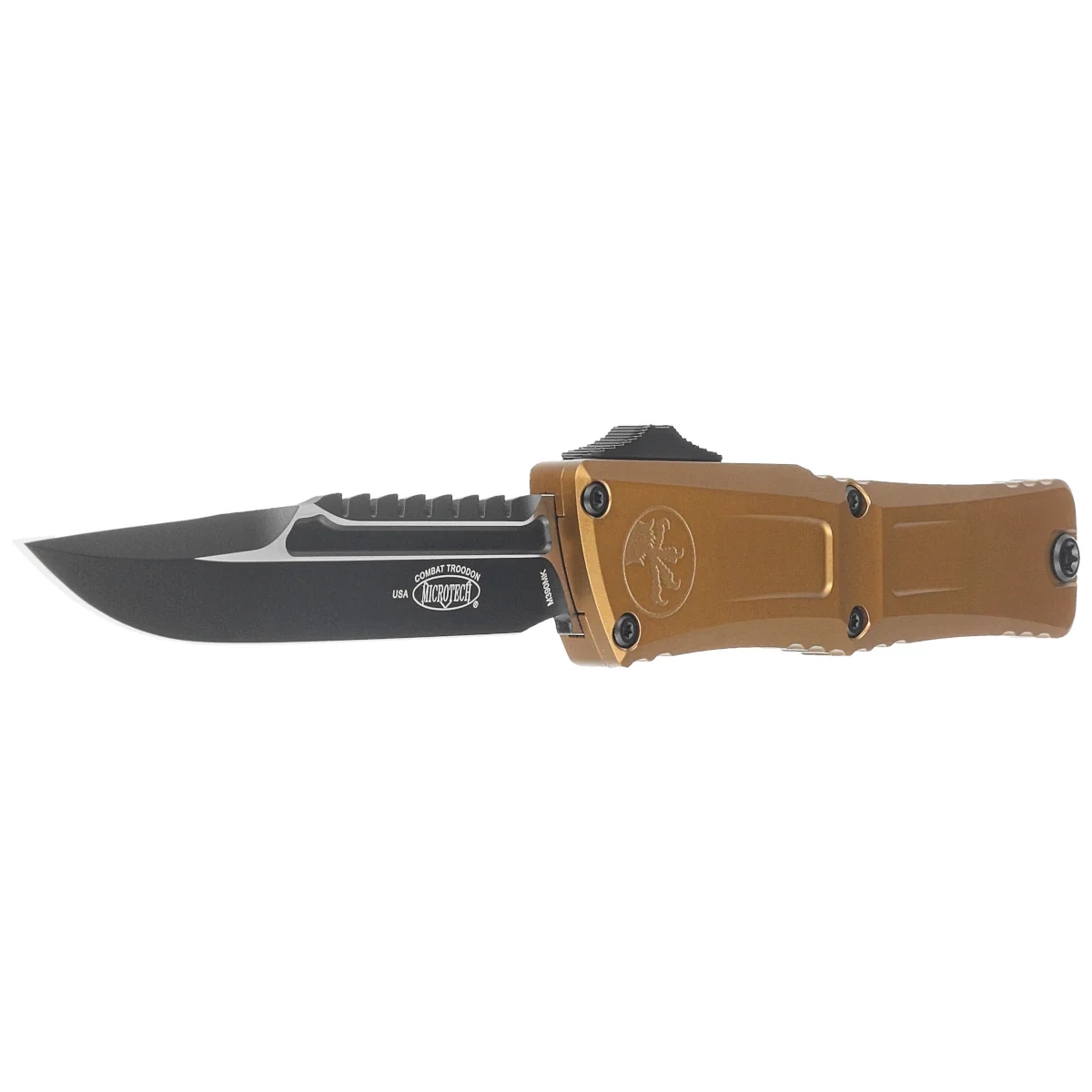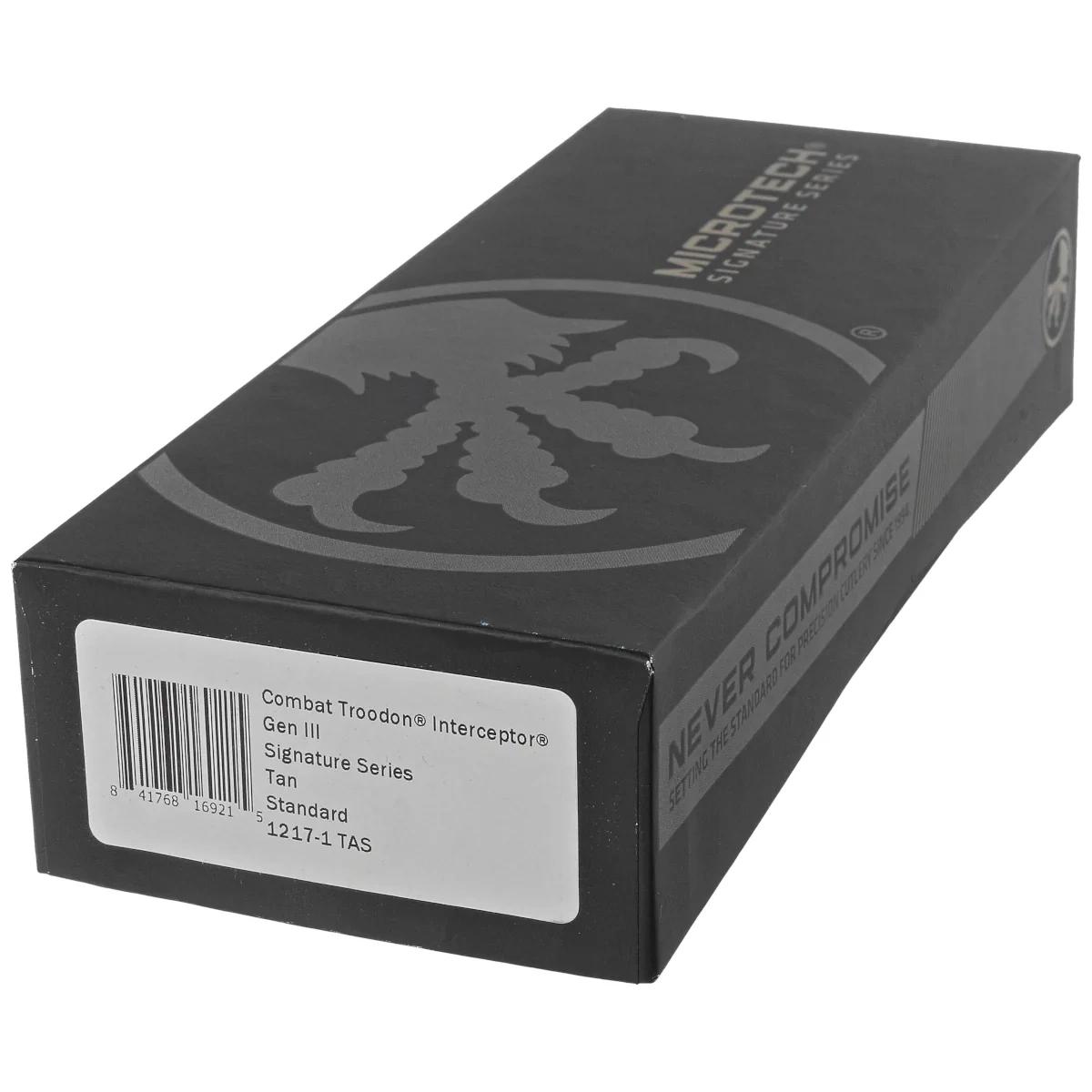 Combat Troodon Gen III Interceptor Signature Tan Aluminum, Black the largest of the automatic knives, is the pinnacle of precision engineering and tactical efficiency in the field of OTF (Out The Front) knives. Built for a wide range of utility applications, it boasts a 25% larger size compared to the flagship Troodon. Precision-crafted, equipped with a sophisticated and extremely fast retractable mechanism, and a new type of razor-sharp blade - Interceptor. 100% manufactured and assembled in the USA. Designed by Anthony Marfione, knifemaker and owner of Microtech Knives.