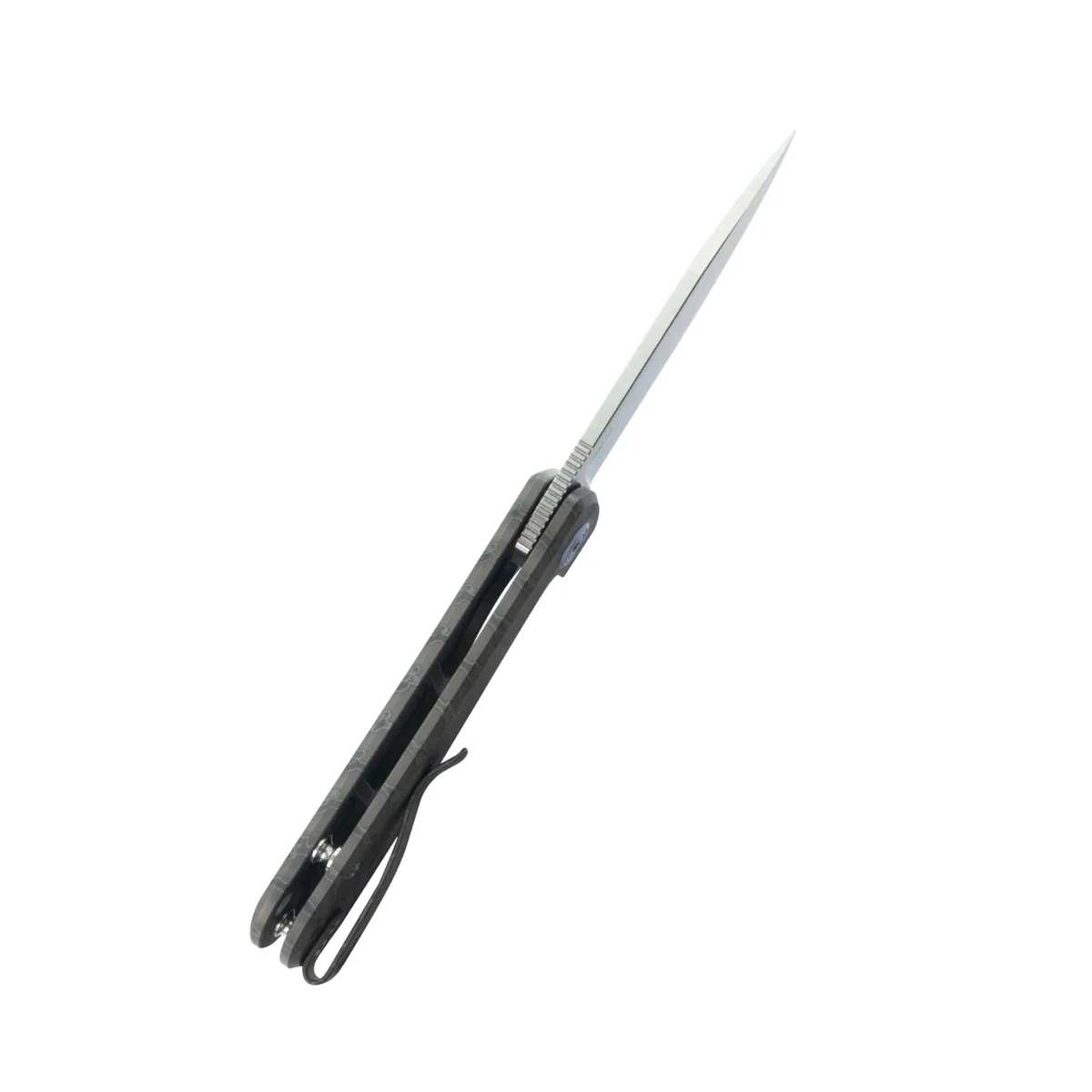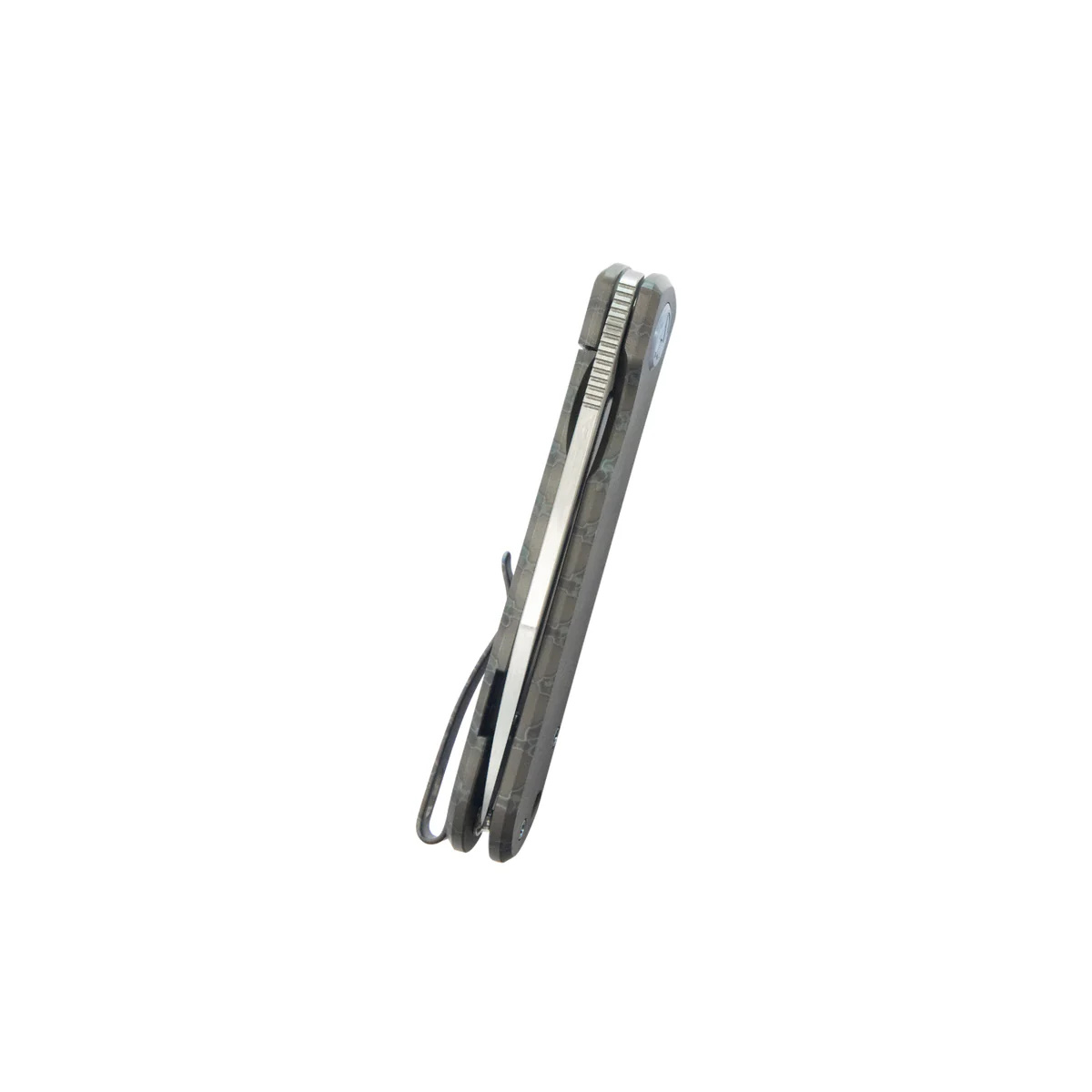 Handle - made of titanium 6AL4V with flame-polished tiger stripes, a virtually indestructible metal that is resistant to weather, chemicals and mechanical damage, are screwed to the steel frame of the knife. The open-backed design without a typical backspacer, attached to each other with steel spacers, makes cleaning easier. The simple, solid design ensures many years of use. The pivot axis is decorated with a titanium cap (Pivot Cap) in a contrasting color. The single-position (right) titanium deep carry clip allows you to carry the knife discreetly in your pocket in a tip-up position (with the tip of the blade up). Above the clip there is a hole for a safety or decorative cord.