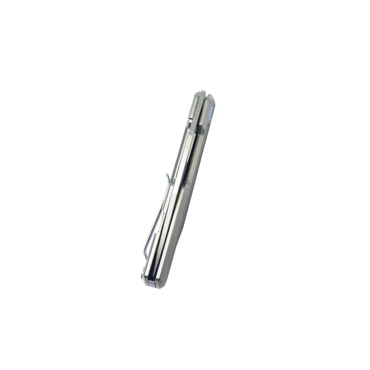 Handle - made of solid titanium 6AL4V, beveled edges of the covers eliminate sharp edges. The slightly rough texture of the handle ensures that the knife does not slip in the hand during use. The whole is screwed to a solid backspacer, also made of titanium. Pivot cap made of titanium in a contrasting color. Forefinger groove improves grip. Single-position (right) titanium deep carry clip allows the knife to be carried discreetly in the pocket in a tip-up position (with the tip of the blade facing up). The upper part of the backspacer has an opening for a safety or decorative cord.