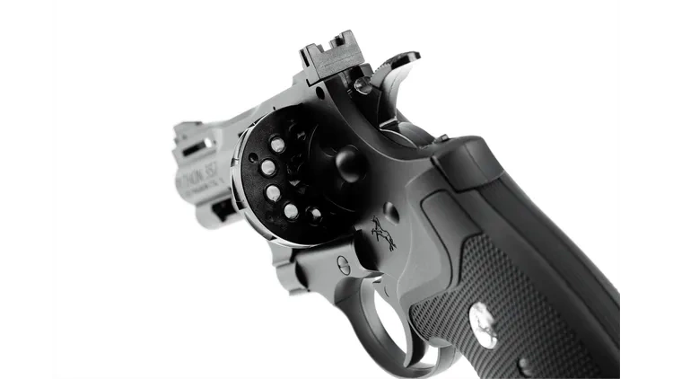 CO2-powered system – The revolver is powered by a standard 12 g CO2 cartridge, housed in the grip. This system delivers an initial projectile velocity of approximately 100 m/s for diabolo pellets and 115 m/s for BBs, allowing for accurate shooting at distances up to 30 m. A single CO2 cartridge provides around 60 shots, and the built-in hex key ensures quick and easy cartridge replacement.