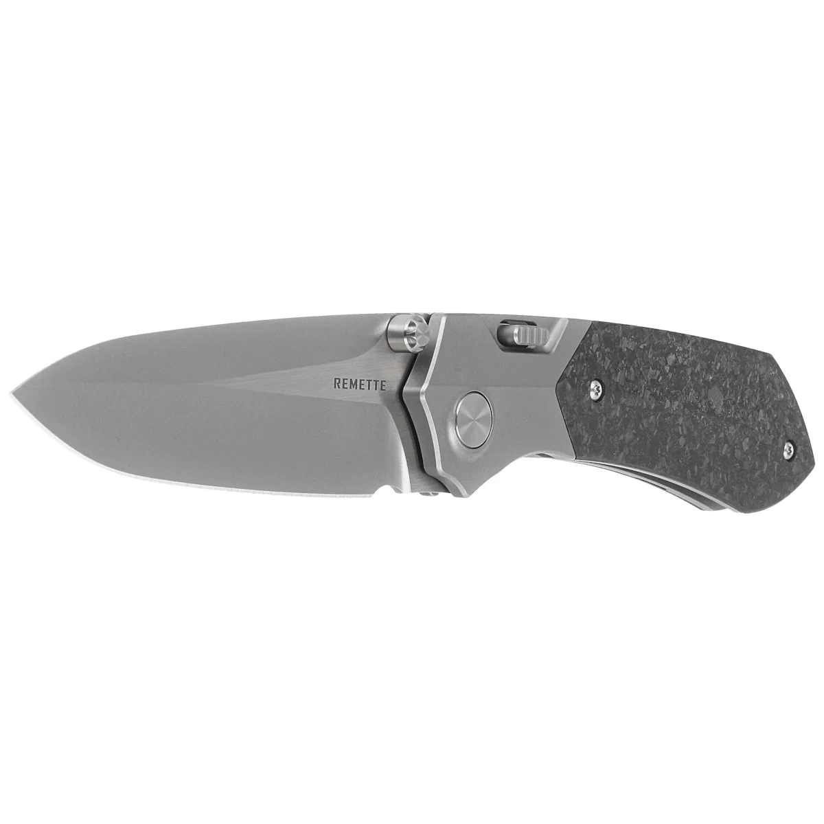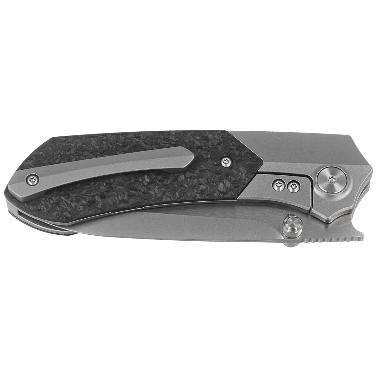 Handle - 6AL4V titanium bolsters, Shredded Carbon Fiber composite handle made of virtually indestructible material, resistant to weather conditions, chemicals and mechanical damage. Beveled edges on the covers eliminate sharp edges. The grips are screwed to a solid titanium backspacer, ensuring that the desired stiffness of the entire structure is maintained. On the left side, there is a wide Button Lock, recessed to prevent accidental opening. The The single-position (right) titanium deep carry clip allows you to carry the knife discreetly in your pocket in a tip-up position (with the tip of the blade up).