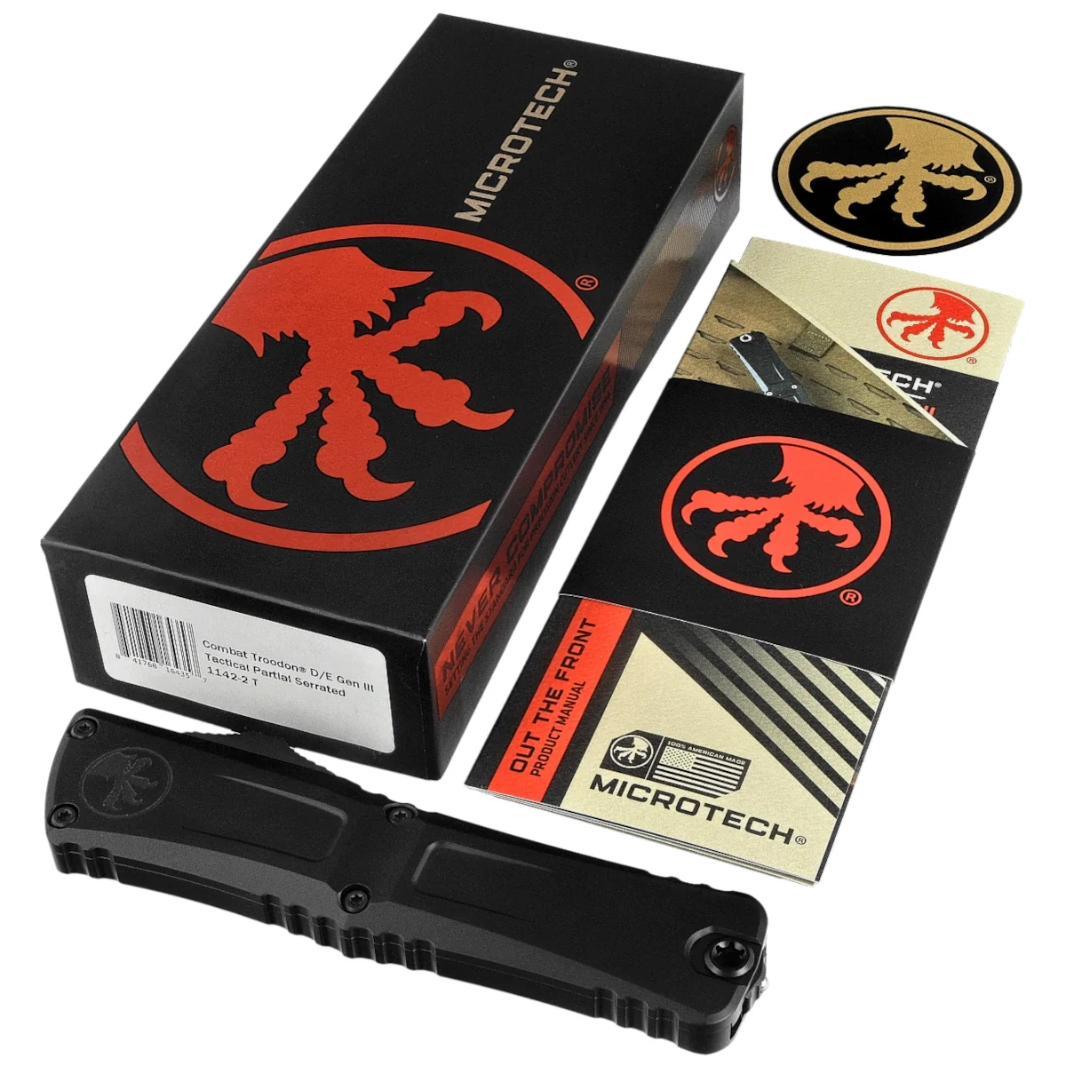 Microtech Combat Troodon Gen III D/E OTF Knife Black Aluminum, Tactical P/S M390MK by Tony Marfione (1142-2T)