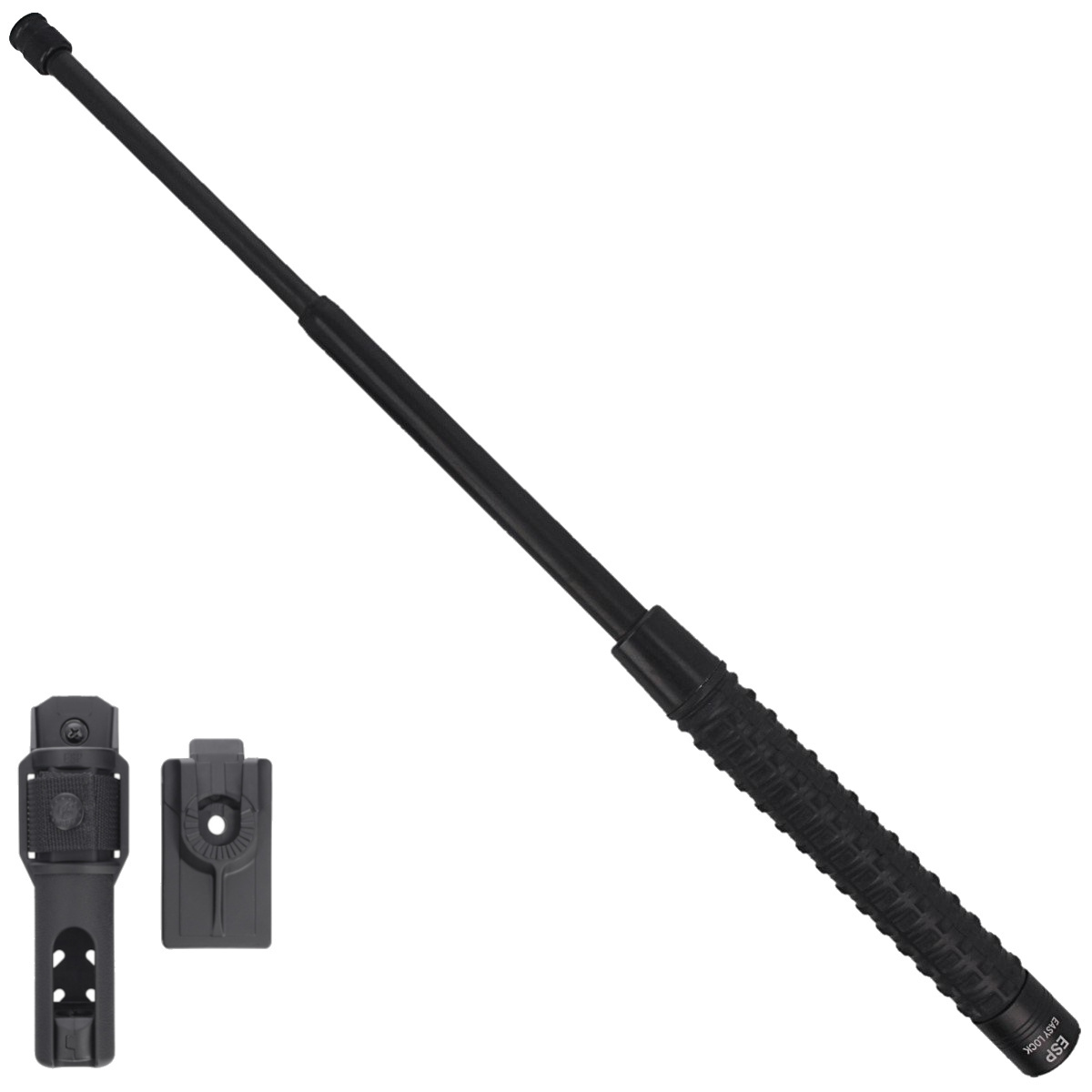 - ExBT-24H, 24” long hardened Easy Lock baton with non-slip grip and Round ending handle. BHT-55 swivel handle that allows the baton to unfold during draw, and the UBC-5-A mount equipped with the Quick Change system.