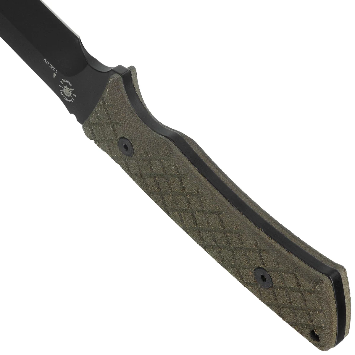 • Damysus Green Canvas Micarta, Black is a versatile, strong full tang knife designed by Special Forces veteran Curtis Iovito. 1095 Cro-Van carbon steel blade, Micarta composite handle. Plastic sheath.