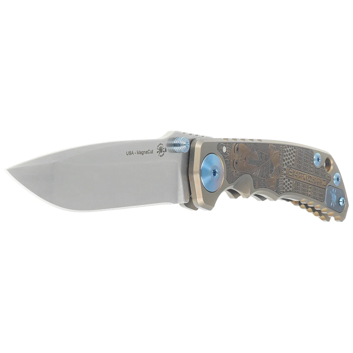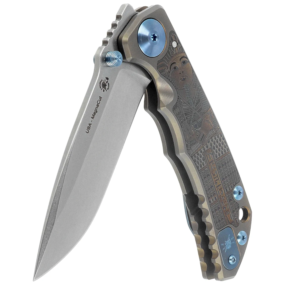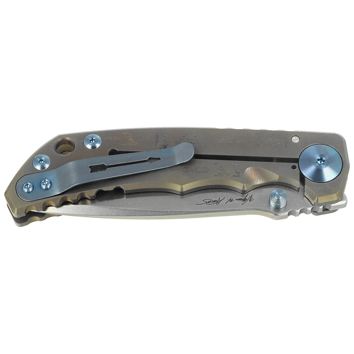 The solid titanium handle is decorated with an artistic engraving of the Egyptian pharaoh Tutankhamun. Blue anodized details complement the design, creating an effective contrast with the brown handle. Thanks to the appropriately shaped handle, the knife lies securely in the hand, ensuring precision during various activities. The robust frame lock guarantees safe use even under extreme conditions. Each knife is handmade in the USA, making it a valuable and sought-after item for collectors and demanding users alike.