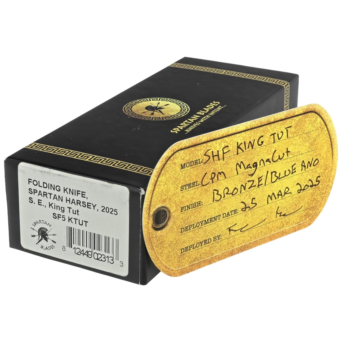 - Spartan Harsey Folder King Tut S.E. Bronze Titanium, Blue HW, Stonewashed, limited edition of the large tactical folder designed by knifemaking legend Bill Harsey. Ergonomic titanium handle with engraving, blade made of high-quality MagnaCut steel.