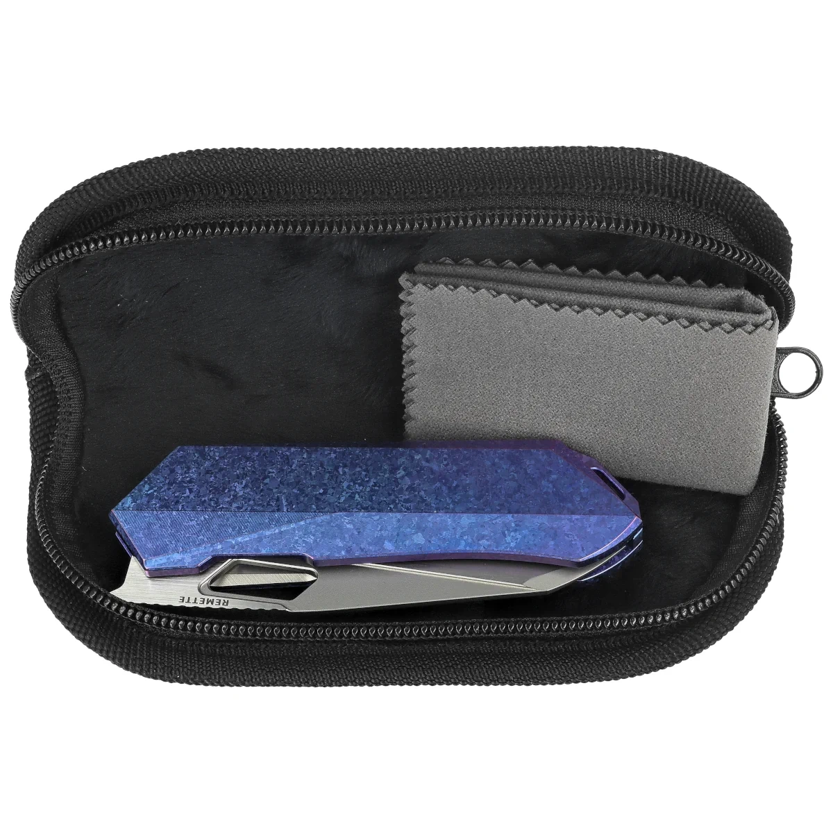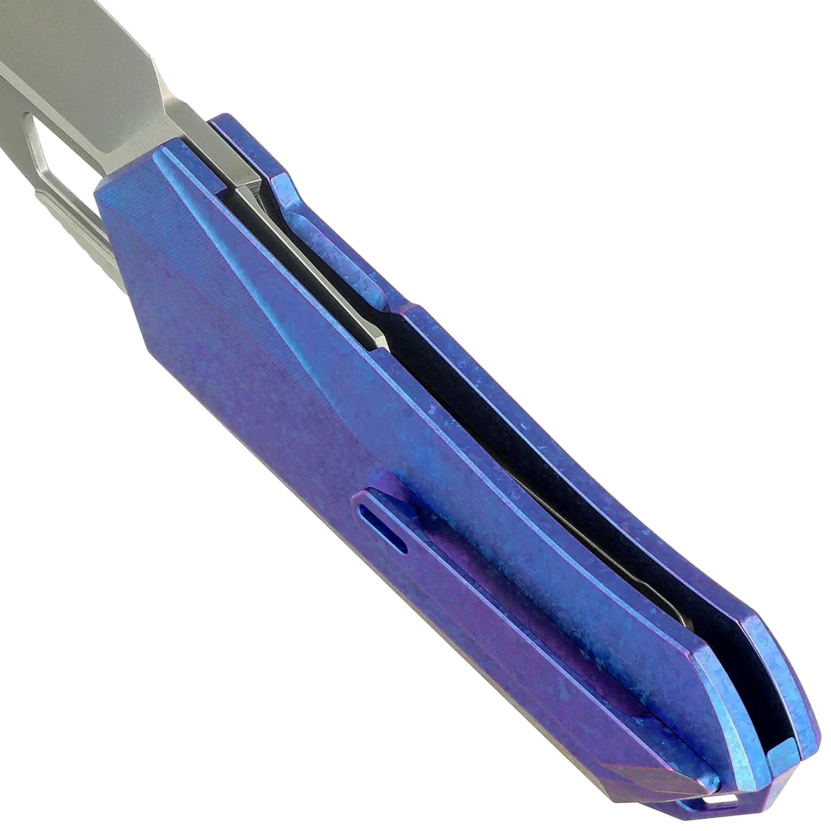 Handle – The skeleton is made of 6AL4V titanium, on which titanium grips are attached without the use of screws, precisely milled from a single piece of material using CNC machine tools. This innovative design ensures exceptional robustness and mechanical resistance. The surface is finished with the Crystal method, giving the whole a stunning visual effect with a subtle, shimmering sheen. The single-position titanium deep carry clip (right side) allows the knife to be carried discreetly in a pocket in a tip-up position (with the tip of the blade up). There is an opening in the back of the handle for a lanyard.