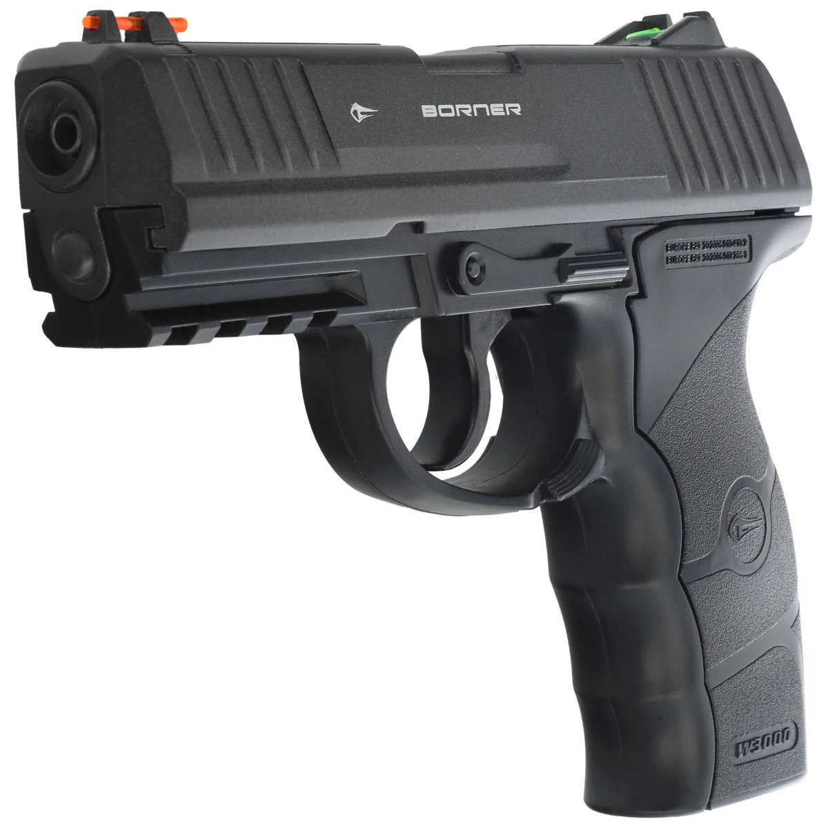 Borner W3000 4.5 mm CO₂ Air Pistol is a durable and realistic replica of the Italian semi-automatic Beretta 90-Two. Its solid construction of metal and ABS ensures excellent durability and user comfort during recreational shooting sessions.