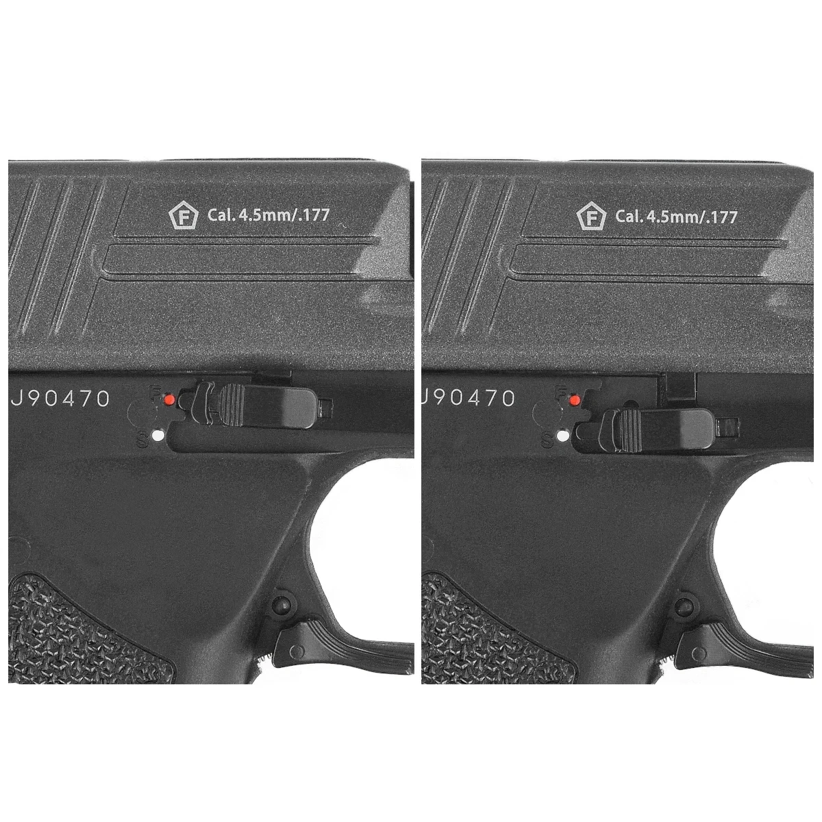 Power Source and Performance – Powered by a 12g CO₂ cartridge, the pistol allows for over 60 shots with 4.46 mm BBs. The realistic Blowback system replicates the functioning of a real firearm, with the slide locking back after the last shot is fired.