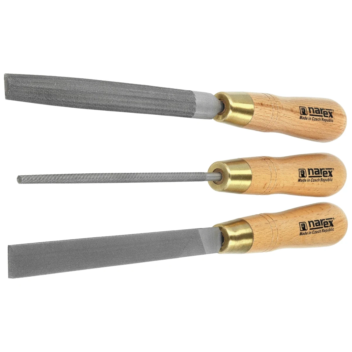 - High-quality 150 mm metal files from the Czech brand Narex. The set includes three file types: flat, half-round, and round. Crafted from high-carbon tool steel, hardened to a hardness of 62 HRC. Features a classic handle made of durable beech wood.