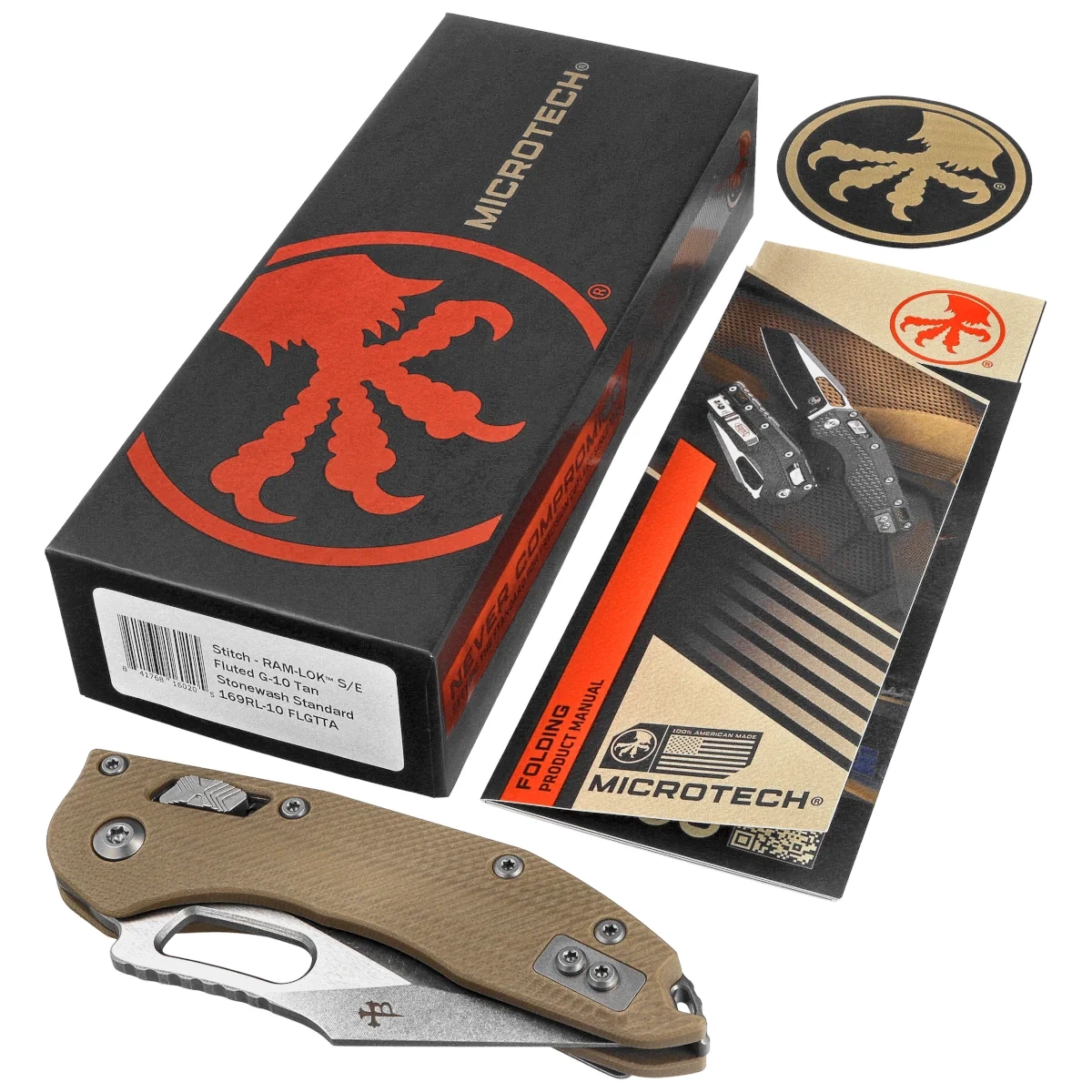 - Stitch Ram-Lok S/E Tan Fluted G10, Stonewashed manual version of the popular design by Sebastijan Berenjie of Borka Blades and Microtech. Wide harpoon-shaped blade, superior materials and legendary quality workmanship from Microtech Knives