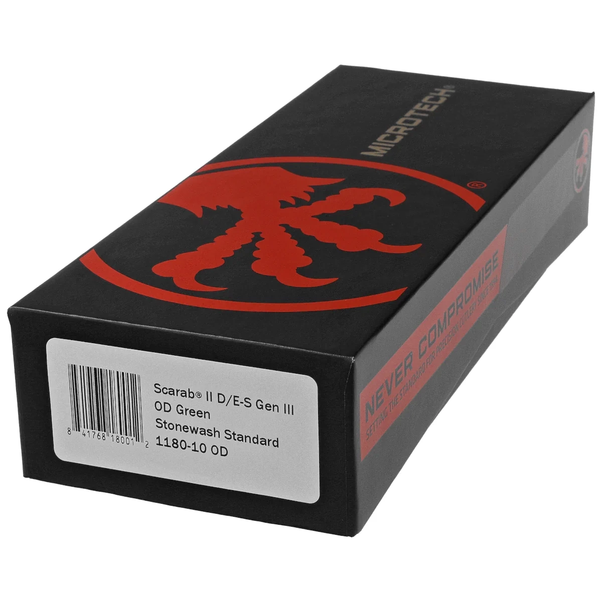 Scarab II Gen III D/E-S OD Green Aluminum/3M, Stonewashed is the pinnacle of excellence in automatic tactical knives, taking inspiration from the original Microtech Ultratech design. Built to withstand the toughest conditions, the new Scarab II is the ultimate choice for heavy use. While retaining the styling features of its predecessor, it sets a new standard for OTF (Out The Front) technology.