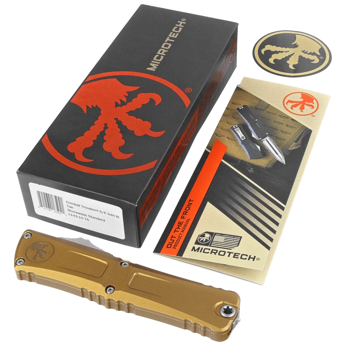 Combat Troodon Gen III S/E Tan Aluminum, Stonewashed this largest of the automatic knives, is the pinnacle of precision engineering and tactical prowess in the field of OTF (Out The Front) knives. Built for a wide range of utility applications, it boasts a 25% larger size compared to the flagship Troodon. Precisely crafted, it features a sophisticated and hellishly fast mechanism that extends the razor-sharp blade. 100% made and assembled in the USA. Designed by Anthony Marfione, knifemaker and owner of Microtech Knives.