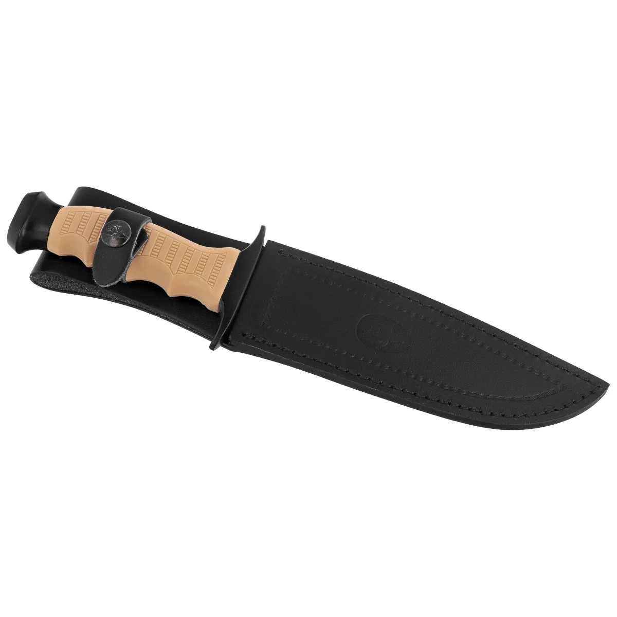 Muela 85-161.D Desert Rubber, Black is a large Bowie-style knife, designed for users who want functionality and confidence in field and tactical applications. Muela, offers in this model a full-size blade, suitable for intensive use - both in survival and professional applications. Blade is made of Nitro-42 steel, nitrided for increased corrosion resistance and improved mechanical performance. Its coating strengthens the surface and reduces the visibility of damage, while the pronounced bowie geometry allows for effective cuts with great control over the blade. As an added bonus, the blade has a dorsal saw, allowing it to cut through fibrous materials, extending the knife's functionality in the field. The handle is based on a construction of blackened zamak and textured rubber, which ensures high resistance to damage, excellent grip and durability in all weather conditions. The ergonomic grip profile makes it easy to operate the knife with gloves and in difficult terrain, while the integrated head and hilt improve safety. The Muela 85-161.D is for those in need of a rugged field tool - reliable, versatile and ready for any task.