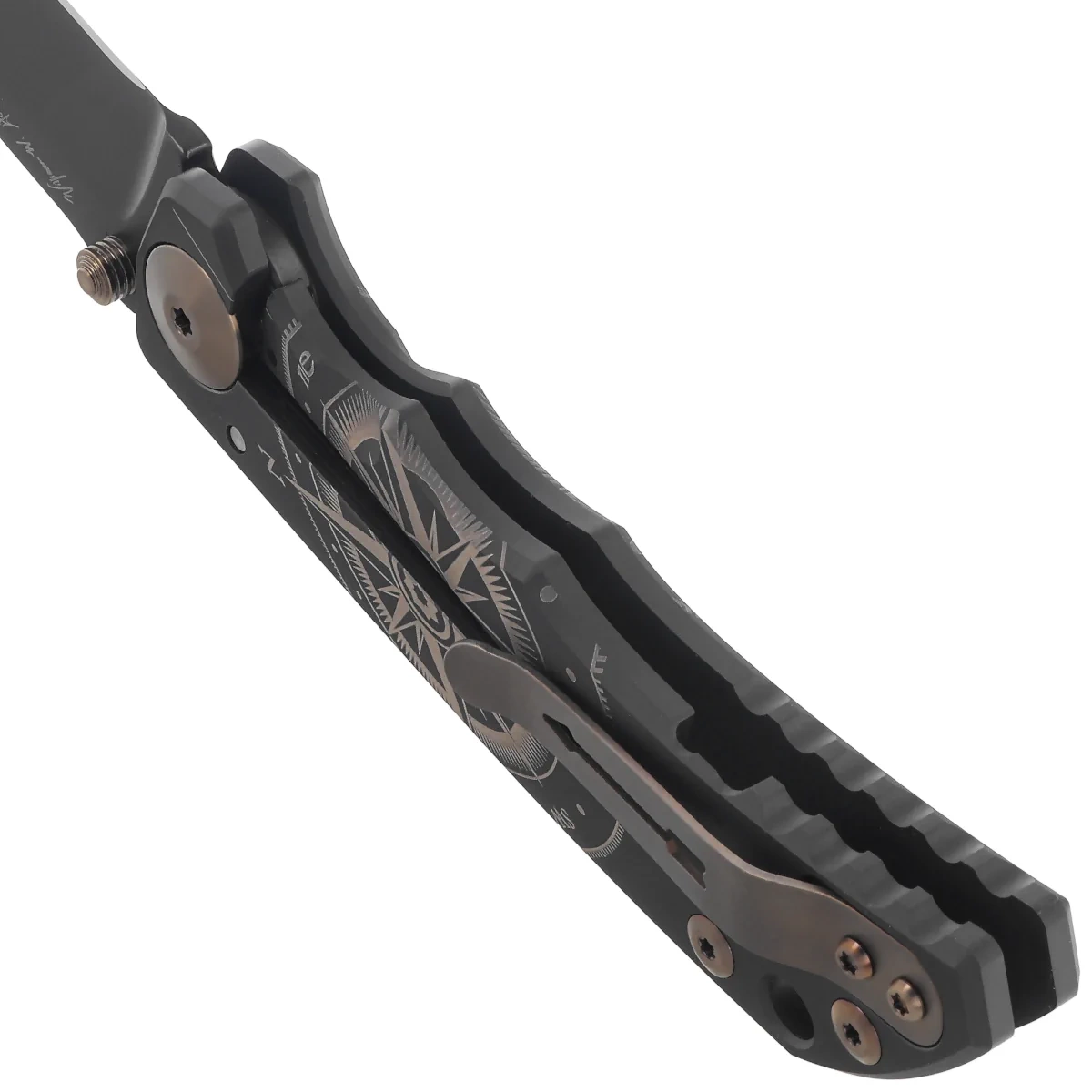 The solid titanium handle is decorated with an artistic engraving, depicting a compass motif with the Rose of the Winds. The whole is complemented by bronze anodized details, which contrast strikingly with the black color of the Handle. Thanks to the properly contoured handle, the knife sits securely in the hand, ensuring precision when performing a variety of activities. The robust frame lock mechanism guarantees safe use even in extreme conditions. Each piece is handmade in the USA, making it a valuable and sought-after item among both collectors and discerning users.