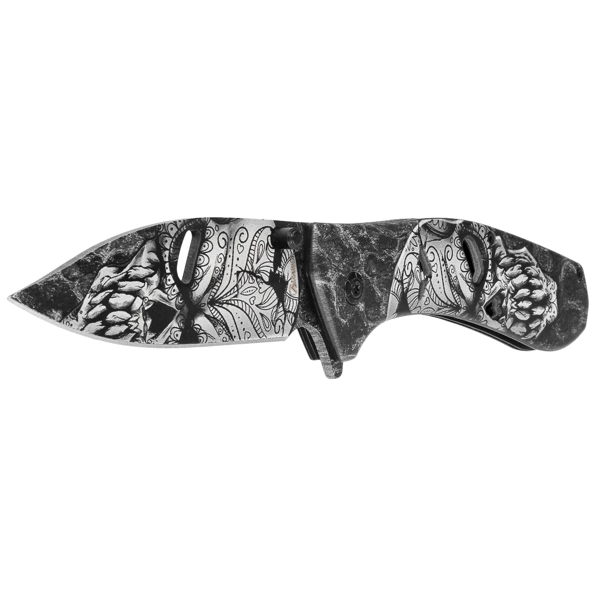 Handle - made of lightweight aluminum, the surface of which is covered with 3D printed 3D Printed in neo-Gothic style, depicting skulls and ornaments in high contrast black and white. Such a treatment gives the knife an individual character and visual depth. Milling and openwork holes improve the grip and reduce the weight of the entire design. The integrated deep carry clip allows you to discreetly carry the folder in your pocket. Handle's aesthetics refer to tactical design with a touch of underground expression - for those who are looking for a tool with a distinct character.