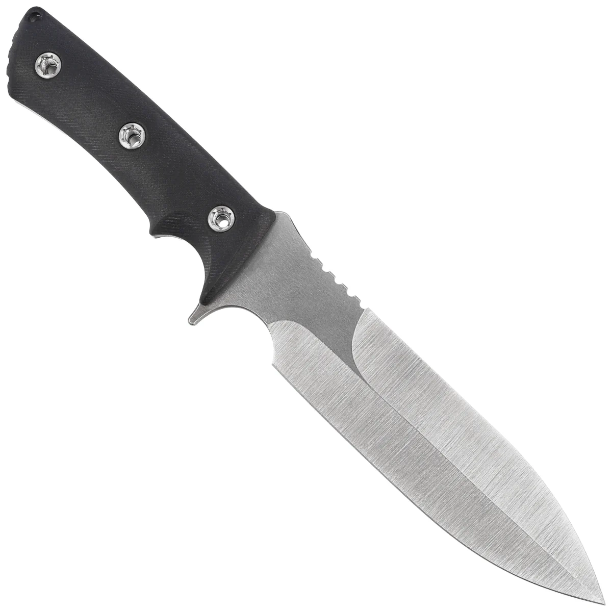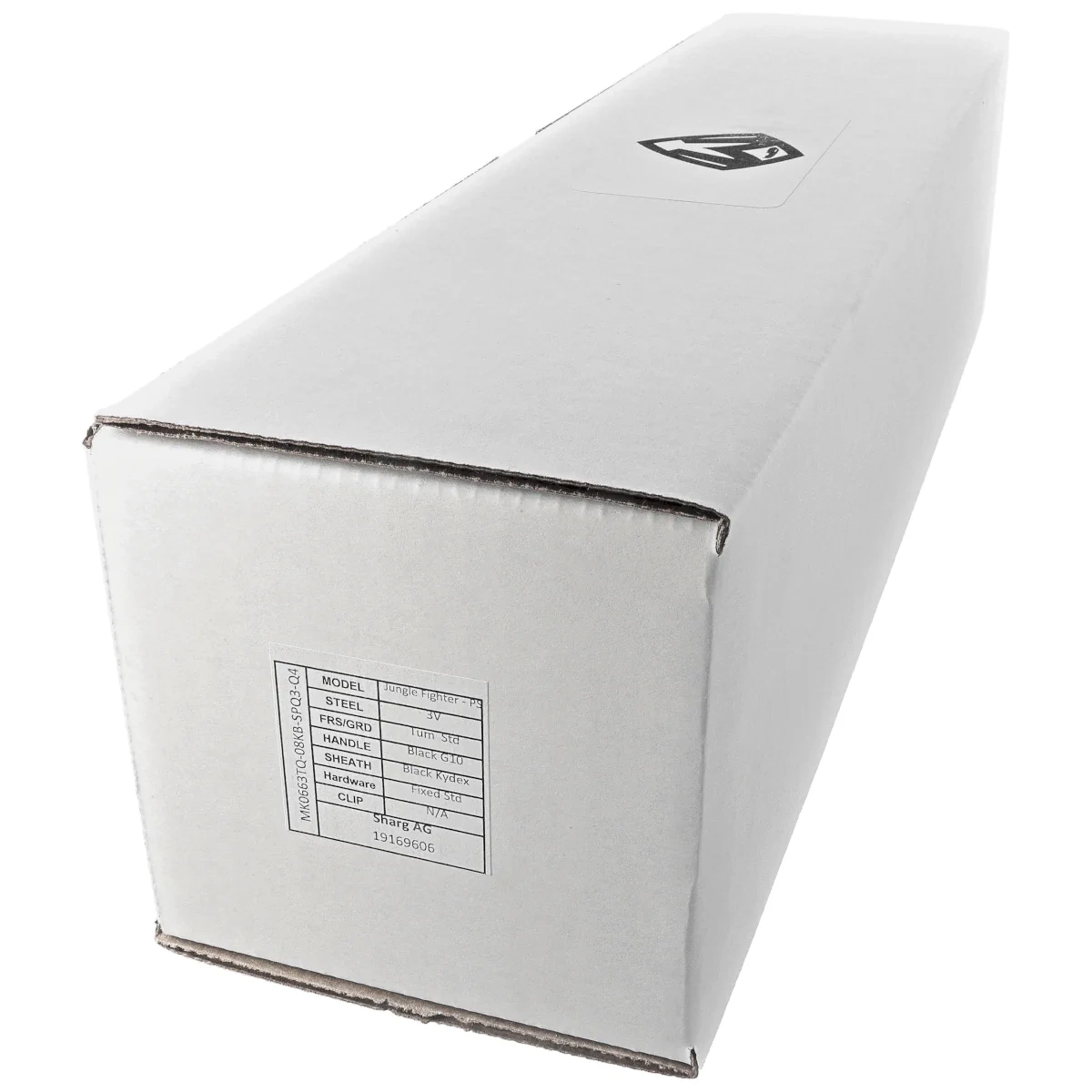 Jungle Fighter Pro Series Black G10, Std HW, Tumbled is the flagship combat knife of the Medford Knife & Tool brand , created by Greg Medford for heavy use in demanding environments. Its design is based on years of experience with the production of tools for military and survivalist services - combining mechanical resistance with ergonomics and absolute reliability. Blade is made of American tool steel CPM 3V, valued for its high resistance to cracking and chipping. Thanks to the tumbled finish, the surface of the blade acquires a raw, utilitarian character that stands up well to wear and masks scratches. The spear point profile and dual grind (hollow / flat) provide both high penetration ability and stability when cutting hard materials. Additional milling on the back (jimping) improves tool control during precision operations. The G10 composite Handle has been molded to provide a secure grip even in gloves, mud or rain. Its aggressive texture and pronounced finger indentations enhance safety and comfort. A three-point bolt attachment ensures the sturdiness of the design, and a rope hole provides additional security for the tool during transport. Included is a kydex sheath compatible with Tek-Lok, allowing easy attachment to a belt or a mount.
