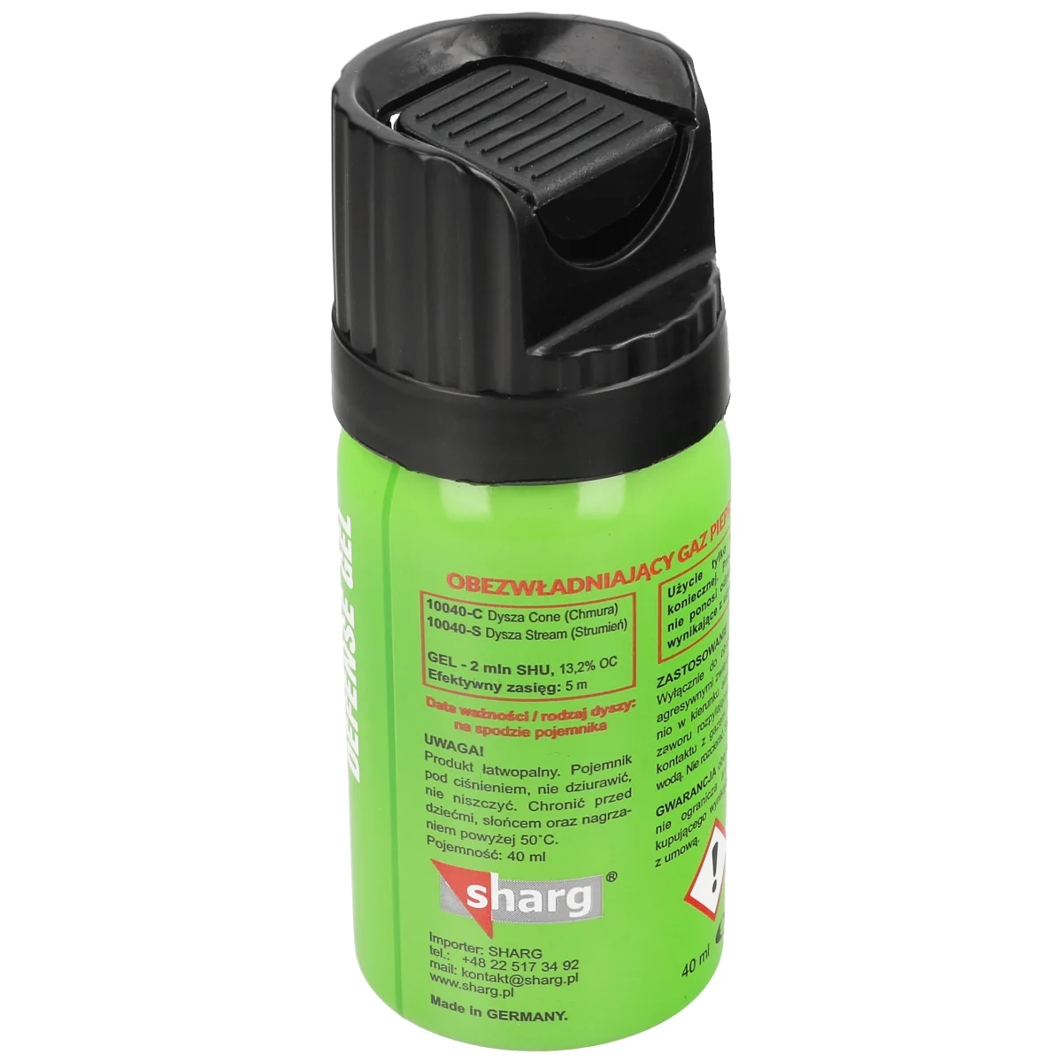 Green Defense Red Pepper Gel 2ml SHU, Cone 40ml. Manufactured in Germany, hand-held pepper spray in gel made by Sharg Company with a new, reinforced formula (2,000,000 SHU, 10% OC). To defend against an attacker / group of attackers who are also under the influence of alcohol or psychoactive substances. Chemical composition also effective for defense against aggressive animals.