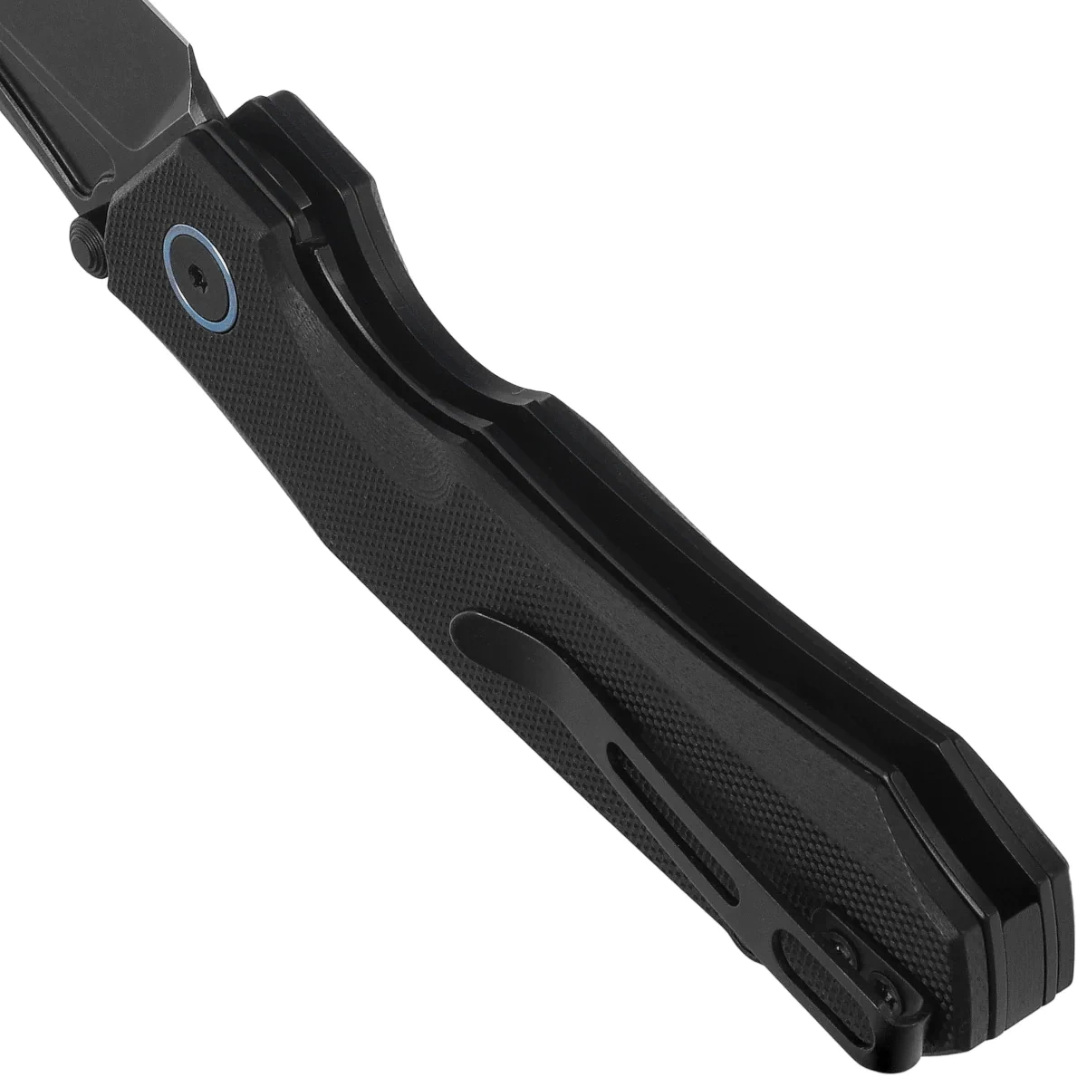 Handle grips - G10 (pressure-pressed fiberglass with synthetic resin), textured for improved grip confidence, bolted to the knife' s steel frame. The massive backspacer to which the grips are attached guarantees the rigidity and strength of the entire structure. A single-position (right) steel deep-carry clip allows you to carry the knife discreetly in your pocket in tip-up position (blade tip up). The decorative ring around the pivot, the so-called pivot collar, is made of blue anodized titanium. The hidden recess of the backspacer contains a place to thread a safety or decorative cord.