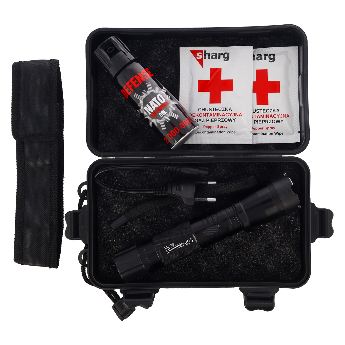 This kit is composed to provide you with a complete spectrum of protection in dangerous situations. The 8 million V stun gun and pepper spray allow for fast and effective defense, decontamination wipes help neutralize the effects of irritants, and the survival case ensures your gear remains safe, dry, and ready for use.