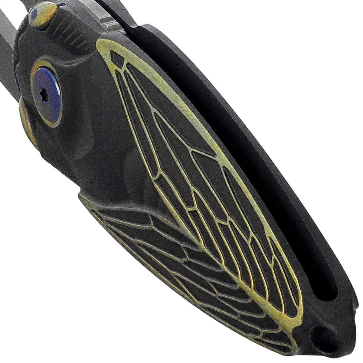- Cicada-DG Dark Gray / Gold Titanium, Bead Blasted - a modern premium folding knife from Rike Knife, with an M390 steel blade and milled titanium handle. Biomechanical form, collectible character and technical precision in one design.