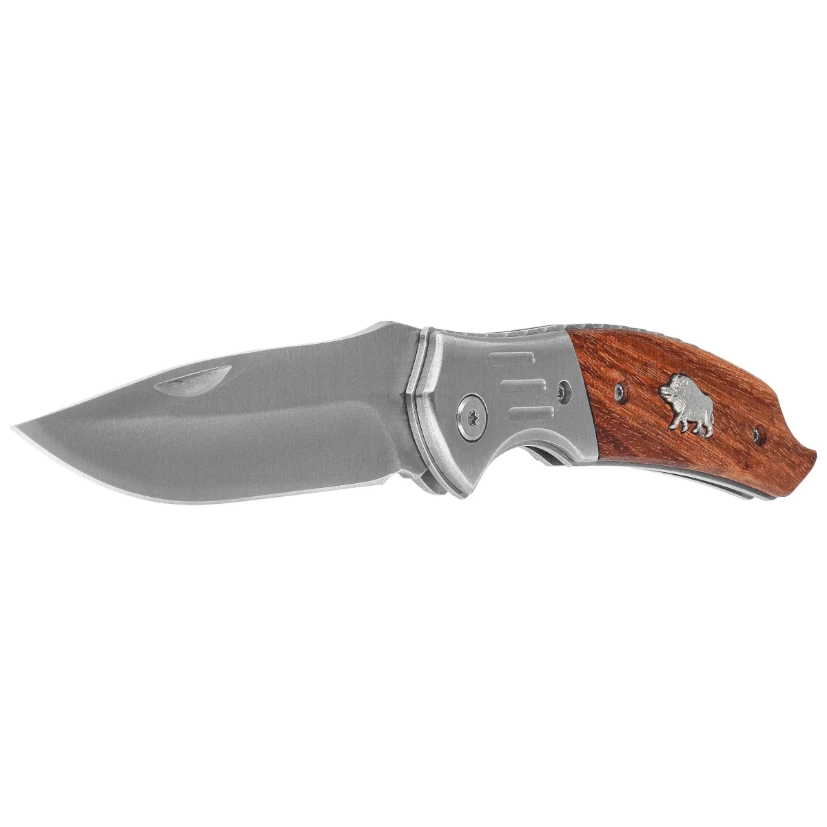 Handle - made of zebrawood is distinguished by a characteristic contrasting grain, giving the knife a unique look. The natural material was combined with a steel frame and bolsters, creating a structure with increased rigidity and resistance. The Handle was decorated with a metal badge in the shape of a boar. The profiling under the fingers aids ergonomics and provides a secure grip in various working positions. At the end of the Handle there is a rope hole - an aesthetically pleasing and functional detail for increased carrying comfort. The overall design is aimed at users who are looking for a folding knife with classic aesthetics and solid workmanship - a tool that works equally well in the pocket or at the belt during outdoor activities.