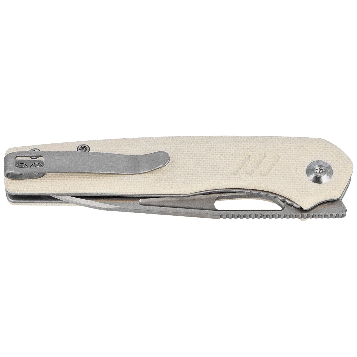 Guile Ivory G10, Satin is the result of a collaboration with designer Shawn Ashmor, a well-known TV actor and talented designer with a penchant for simple, technical forms with a high degree of utility. In this minimalist folder you will find the essence of an approach in which form follows function - without excess ornamentation, instead with a full focus on ergonomics and design details. Guile was created as an everyday tool with clean lines that will find its way into both the pocket of the urban user and the off-roader's gear. The blade is made of 14C28N, a stainless steel valued for its corrosion resistance, easy maintenance and good edge retention. The Wharncliffe profile and flat grind promote precise cuts, while the satin finish adds an elegant touch to the blade. Handle grips based on steel liners and G10 composite grips offer low weight and sturdiness. Subtle texturing improves the grip, and a deep carry clip allows for convenient, discreet carrying. The user has two opening methods at his disposal: a front flipper and a cutout in the Blade, which increases comfort. The whole is complemented by a liner lock, ensuring safe operation with smooth handling.